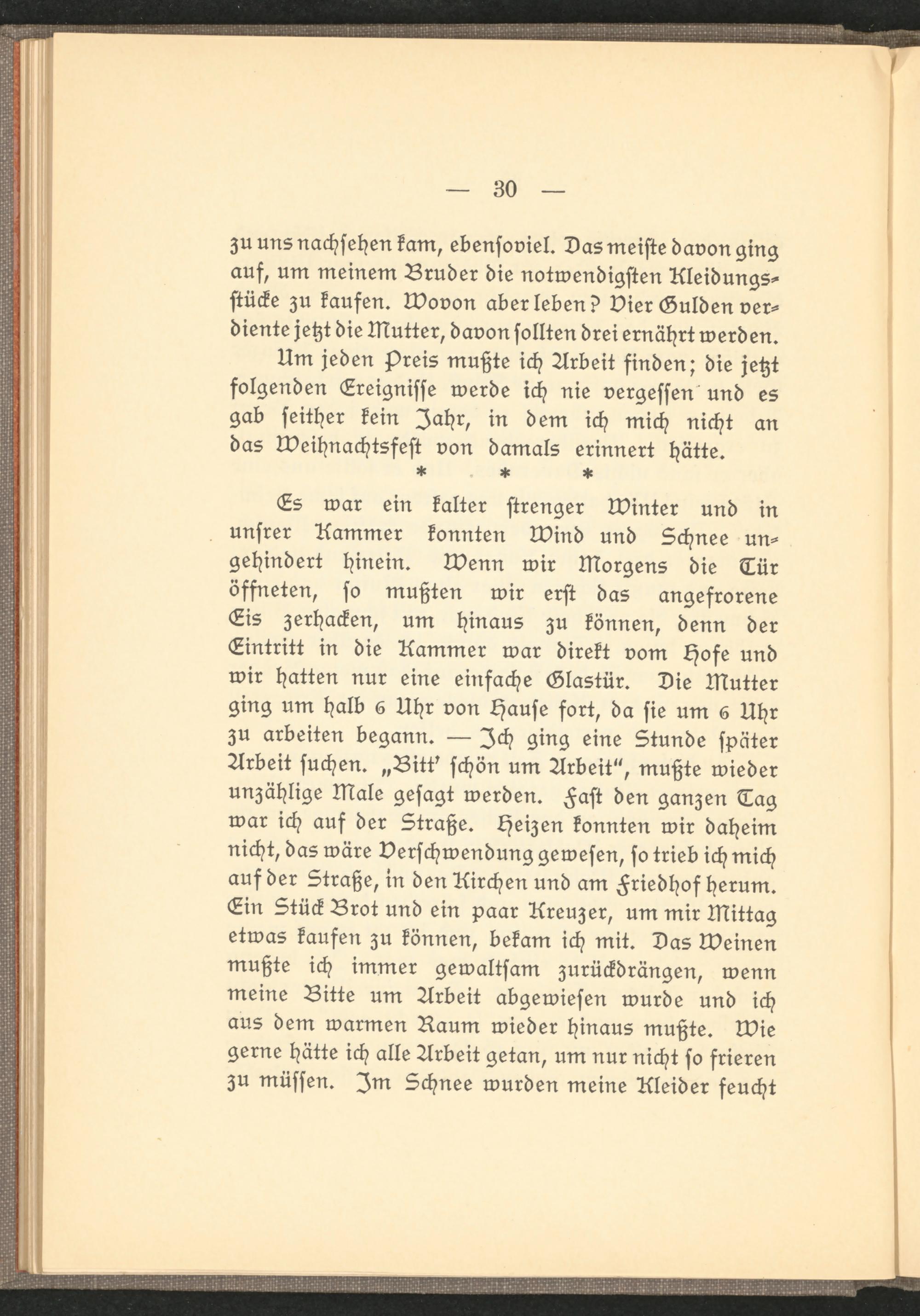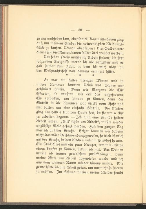 Es war ein kalter strenger Winter und in unsrer Kammer konnten wind und Schnee ungehindert hinein, wenn wir Morgens die Tür öffneten, so mußten wir erst das angefrorene Eis zerhacken, um hinaus zu können, denn der Eintritt in die Kammer war direkt vom Hofe und wir hatten nur eine einfache Glastür. Die Mutter ging um halb 6 Uhr von Hause fort, da sie um 6 Uhr zu arbeiten begann. — Ich ging eine Stunde später Arbeit suchen. „Bitt' schön um Arbeit", mußte wieder unzählige Male gesagt werden. Fast den ganzen Tag war ich auf der Straße. Heizen konnten wir daheim nicht, das wäre Verschwendung gewesen, so trieb ich mich auf der Straße, in den Kirchen und am Friedhof herum. Ein Stück Brot und ein paar Kreuzer, um mir Mittag etwas kaufen zu können, bekam ich mit. Das Weinen mußte ich immer gewaltsam zurückdrängen, wenn meine Bitte um Arbeit abgewiesen wurde und ich aus dem warmen Raum wieder hinaus mußte, wie gerne hätte ich alle Arbeit getan, um nur nicht so frieren zu müssen. )m Schnee wurden meine Kleider feucht