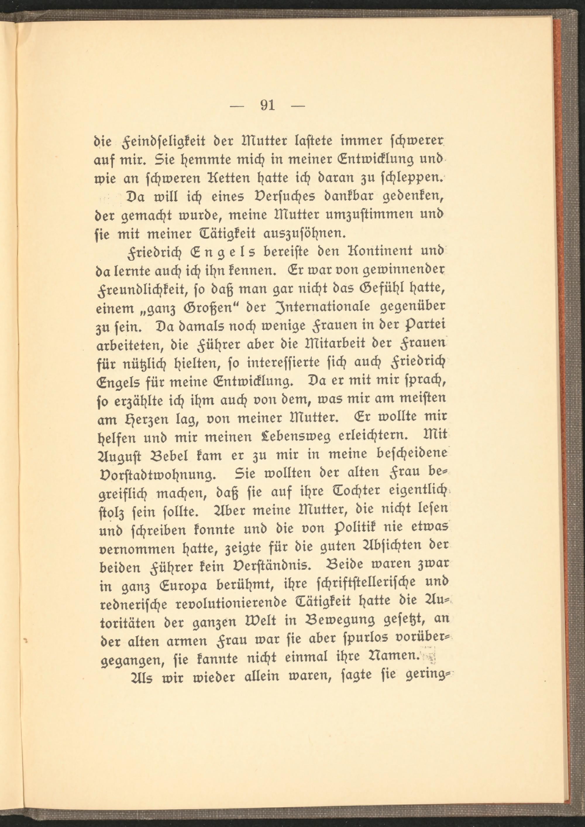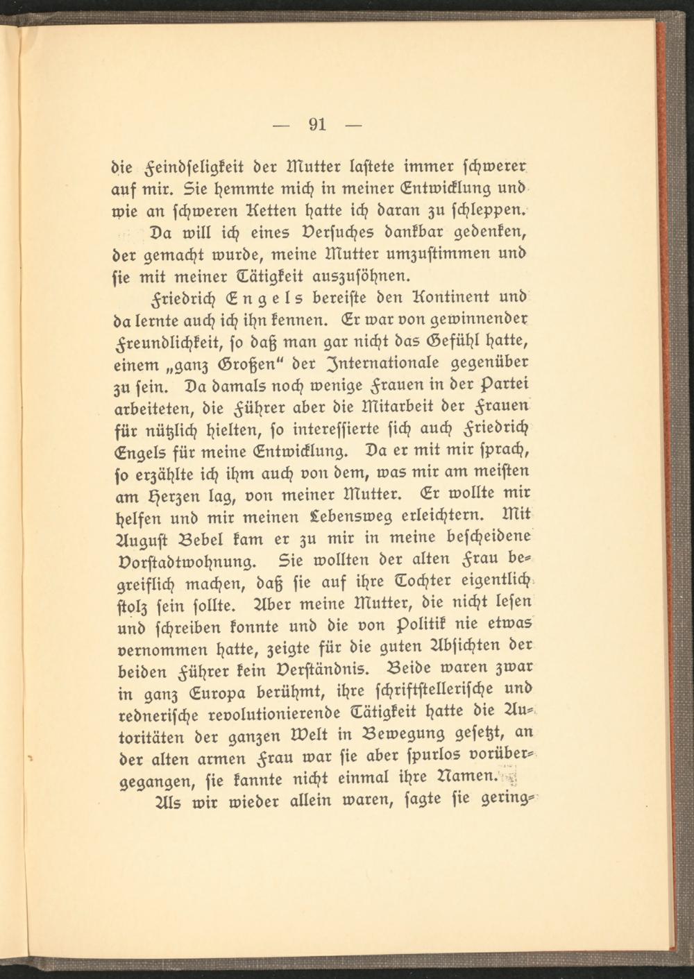 Friedrich Engels bereiste den Kontinent und da lernte auch ich ihn kennen. Er war von gewinnender Freundlichkeit, so daß man gar nicht das Gefühl hatte, einem „ganz Großen" der Internationale gegenüber zu sein. Da damals noch wenige Frauen in der Partei arbeiteten, die Führer aber die Mitarbeit der Frauen für nützlich hielten, so interessierte sich auch Friedrich Engels für meine Entwicklung. Da er mit mir sprach, so erzählte ich ihm auch von dem, was mir am meisten am Herzen lag, von meiner Mutter. Er wollte mir helfen und mir meinen Lebensweg erleichtern. Mit August Bebel kam er zu mir in meine bescheidene Vorstadtwohnung. Sie wollten der alten Frau begreiflich machen, daß sie auf ihre Tochter eigentlich stolz sein sollte. Aber meine Mutter, die nicht lesen und schreiben konnte und die von Politik nie etwas vernommen hatte, zeigte für die guten Absichten der beiden Führer kein Verständnis. Beide waren zwar in ganz Europa berühmt, ihre schriftstellerische und rednerische revolutionierende Tätigkeit hatte die Autoritäten der ganzen lvelt in Bewegung gesetzt, an der alten armen Frau war sie aber spurlos vorübergegangen, sie kannte nicht einmal ihre Namen. ^