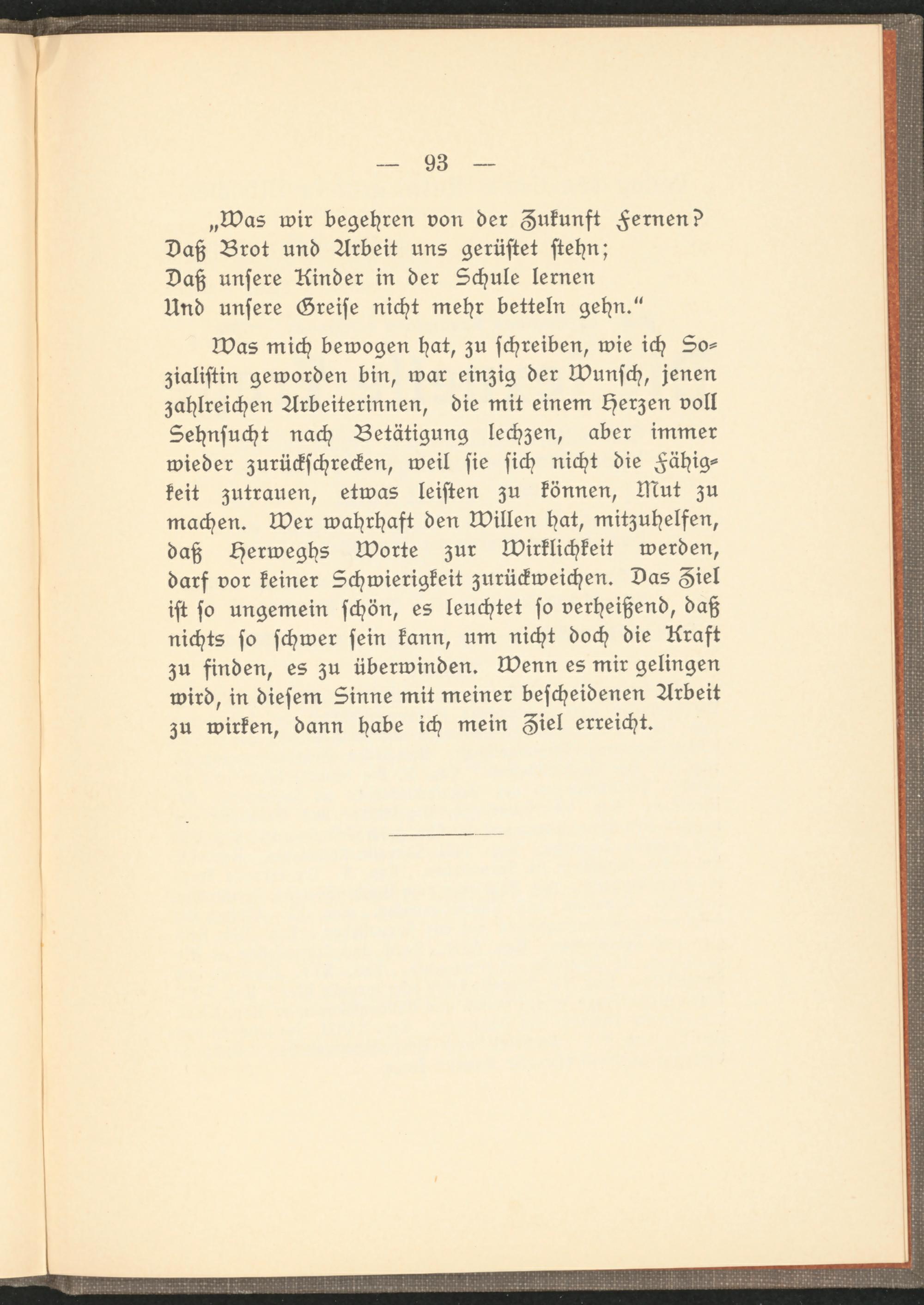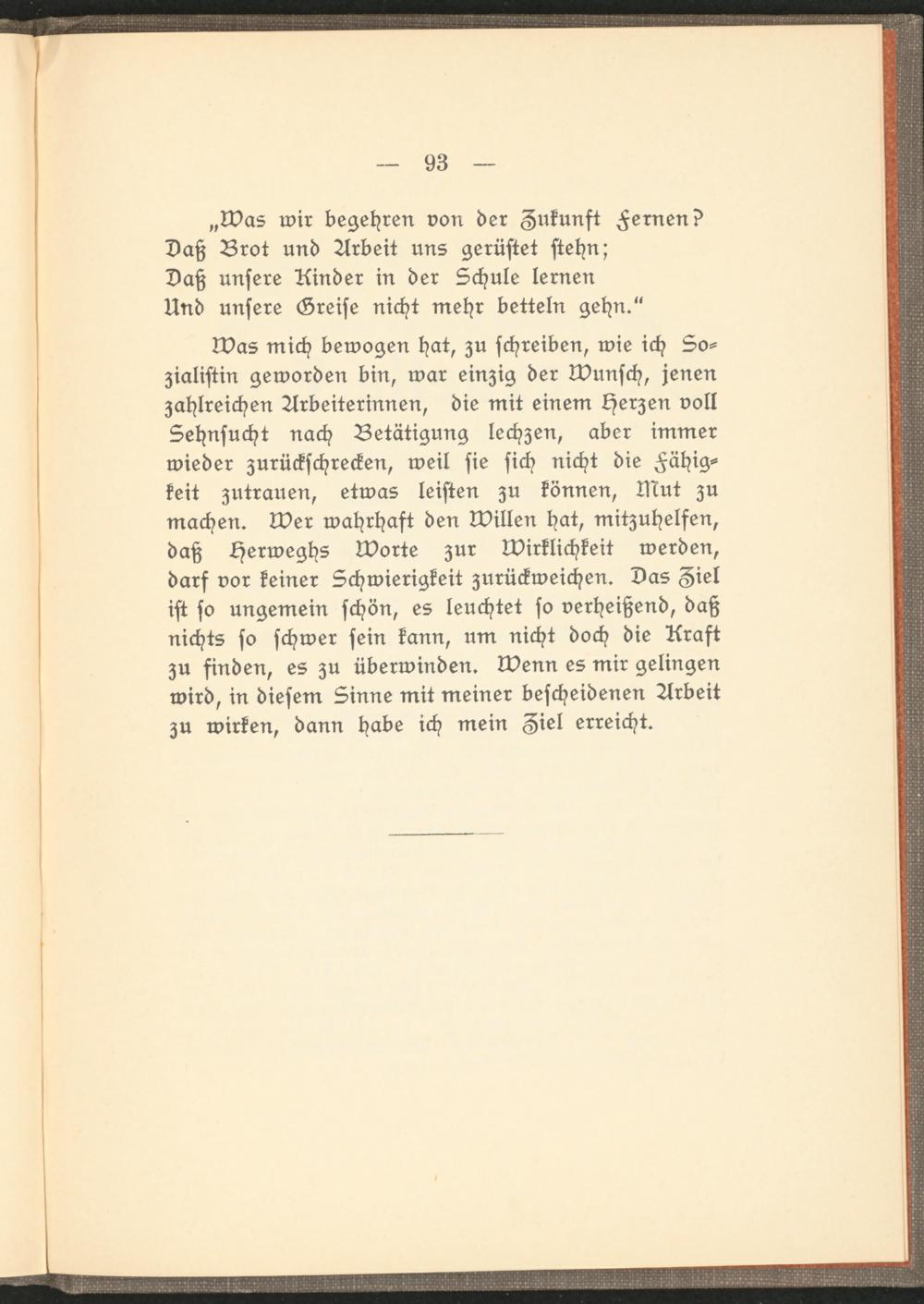Was mich bewogen hat, zu schreiben, wie ich So- zialistin geworden bin, war einzig der Wunsch, jenen zahlreichen Arbeiterinnen, die mit einem Herzen voll Sehnsucht nach Betätigung lechzen, aber immer wieder zurückschrecken, weil sie sich nicht die Fähigkeit zutrauen, etwas leisten zu können, Mut zu machen. Wer wahrhaft den Willen hat, mitzuhelfen, daß Herweghs Worte zur Wirklichkeit werden, darf vor keiner Schwierigkeit zurückweichen. Das Ziel ist so ungemein schön, es leuchtet so verheißend, daß nichts so schwer sein kann, um nicht doch die Kraft zu finden, es zu überwinden, wenn es mir gelingen wird, in diesem Sinne mit meiner bescheidenen Arbeit zu wirken, dann habe ich mein Ziel erreicht.