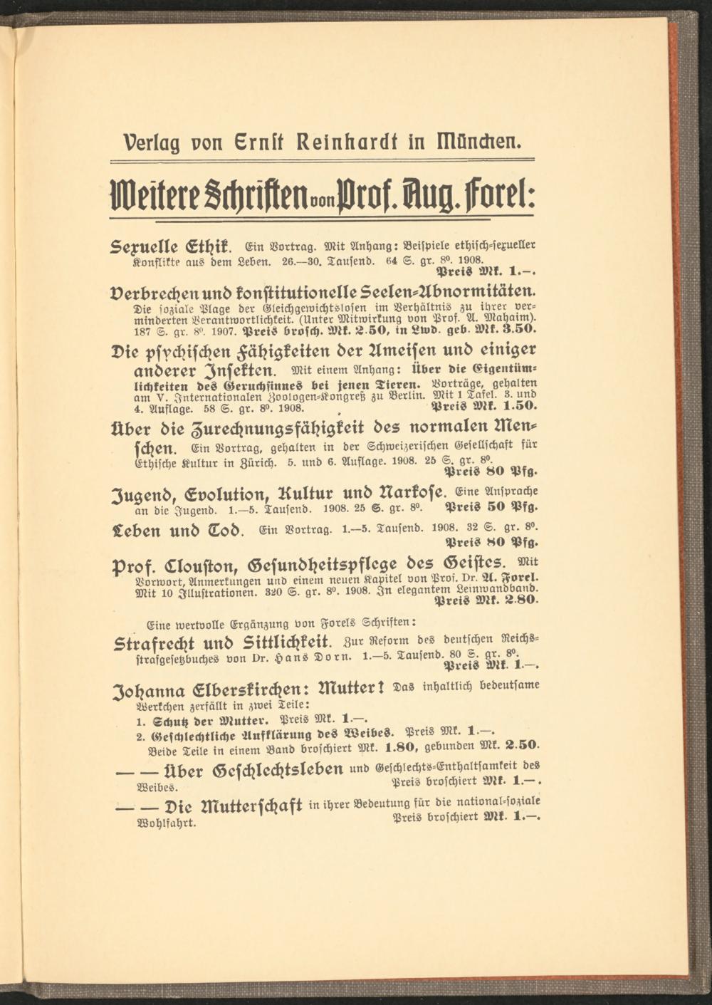 über die Zurechnungsfähigkeit des normalen Menschen. Ein Vortrag, gehalten in der Schweizerischen Gesellschaft für Ethische Kultur in Zürich. 5. und 6. Auflage. 1908. 2b S. gr. 8°.