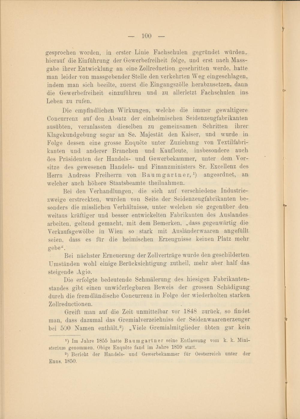 Die empfindlichen Wirkungen, welche die immer gewaltigere Concurrenz auf den Absatz der einheimischen Seidenzeugfabrikanten ausübten, veranlassten dieselben zu gemeinsamen Schritten ihrer Klagekundgebung sogar an Se. Majestät den Kaiser, und wurde in Folge dessen eine grosse Enquete unter Zuziehung von Textilfabrikanten und anderer Branchen und Kaufleute, insbesondere auch des Präsidenten der Handels- und Gewerbekammer, unter dem Vorsitze des gewesenen Handels- und Finanzministers Sr. Exeellenz des Herrn Andreas Freiherrn von llaumgartner ? A ) angeordnet, an welcher auch höhere Staatsbeamte theilnahmen.