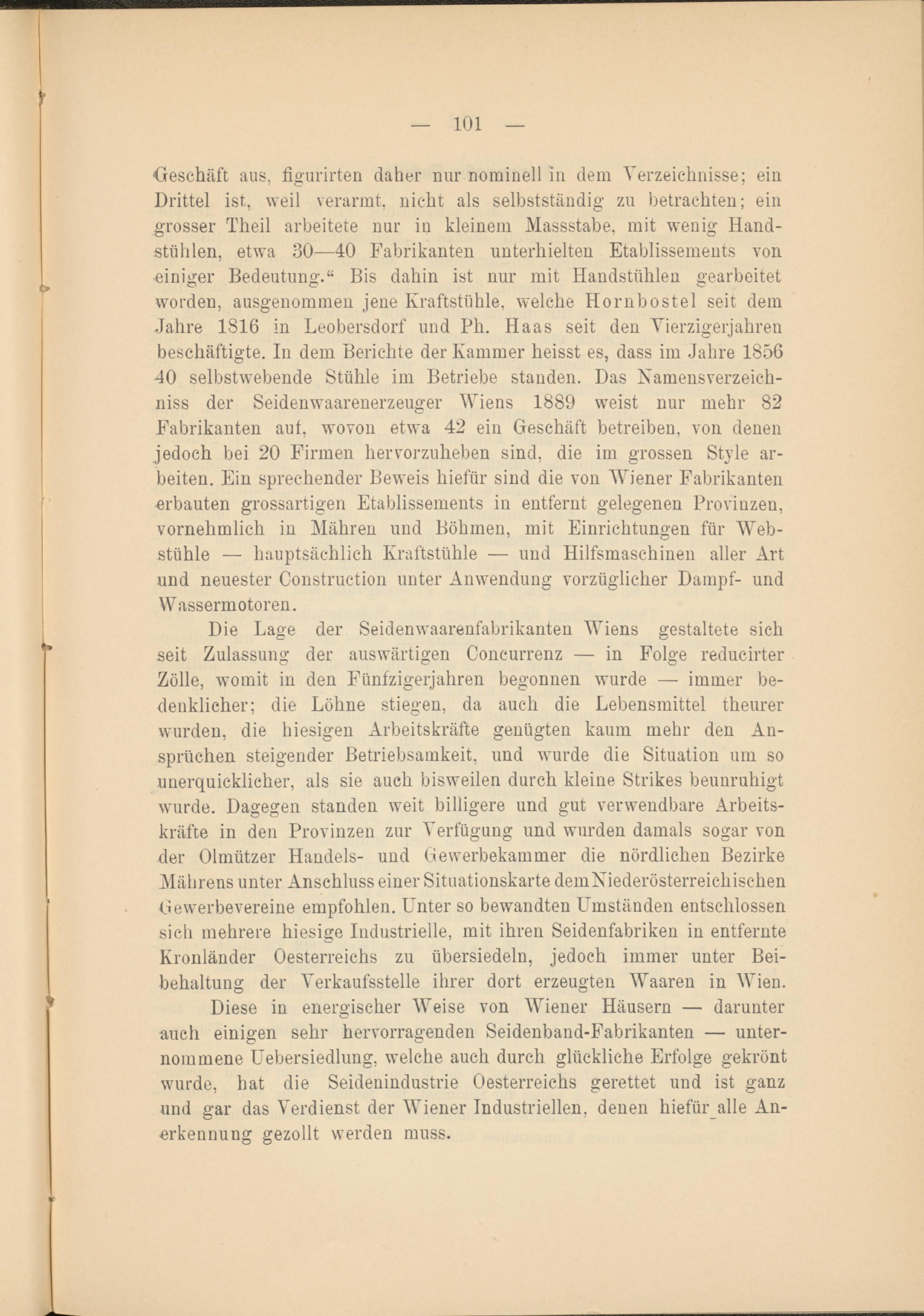Die Lage der Seidenwaarenfabrikanten Wiens gestaltete sich seit Zulassung der auswärtigen Concurrenz — in Folge reducirter Zölle, womit in den Fünfzigerjahren begonnen wurde — immer bedenklicher; die Löhne stiegen, da auch die Lebensmittel theurer wurden, die hiesigen Arbeitskräfte genügten kaum mehr den Ansprüchen steigender Betriebsamkeit, und wurde die Situation um so unerquicklicher, als sie auch bisweilen durch kleine Strikes beunruhigt wurde. Dagegen standen weit billigere und gut verwendbare Arbeitskräfte in den Provinzen zur Verfügung und wurden damals sogar von der Olmützer Handels- und Gewerbekammer die nördlichen Bezirke Mährens unter Anschluss einer Situationskarte dem Niederösterreichischen Gewerbevereine empfohlen. Unter so bewandten Umständen entschlossen sich mehrere hiesige Industrielle, mit ihren Seidenfabriken in entfernte Kronländer Oesterreichs zu übersiedeln, jedoch immer unter Beibehaltung der Verkaufsstelle ihrer dort erzeugten Waaren in Wien.