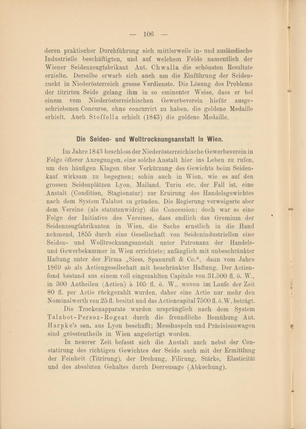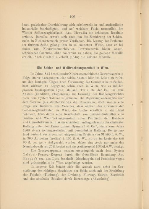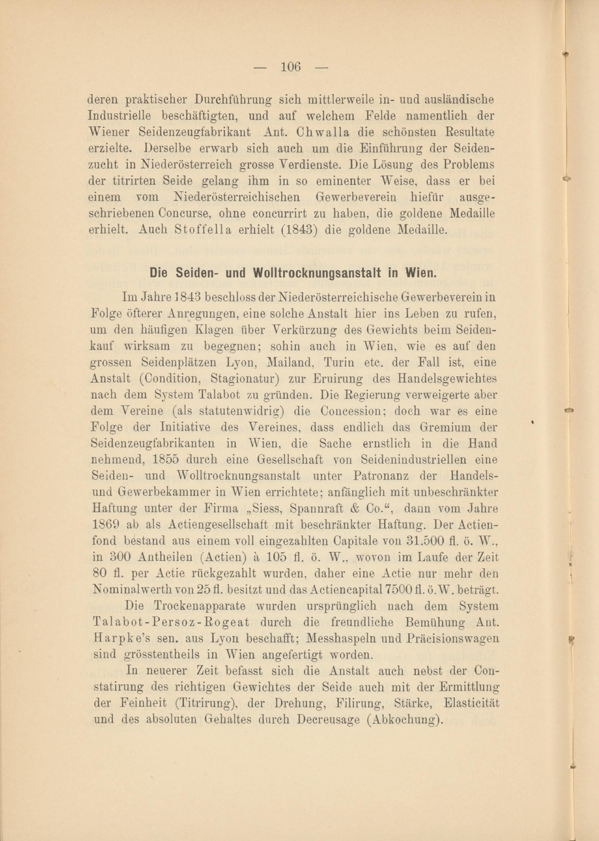 Im Jahre 1843 beschloss der Niederösterreichische Gewerbeverein in Folge öfterer Anregungen, eine solche Anstalt hier ins Leben zu rufen, um den häufigen Klagen über Verkürzung des Gewichts beim Seidenkauf wirksam zu begegnen; sohin auch in Wien, wie es auf den grossen Seidenplätzen Lyon, Mailand, Turin etc. der Fall ist, eine Anstalt (Condition, Stagionatur) zur Eruirung des Handelsgewichtes nach dem System Talabot zu gründen. Die Regierung verweigerte aber dem Vereine (als statutenwidrig) die Concession; doch war es eine Folge der Initiative des Vereines, dass endlich das Gremium der Seidenzeugfabrikanten in Wien, die Sache ernstlich in die Hand nehmend, 1855 durch eine Gesellschaft von Seidenindustriellen eine Seiden- und Wolltrocknungsanstalt unter Patronanz der Handelsund Gewerbekammer in Wien errichtete; anfänglich mit unbeschränkter Haftung unter der Firma „Siess, Spannraft & Co.“, dann vom Jahre 1869 ab als Actiengesellschaft mit beschränkter Haftung. Der Actien- fond bestand aus einem voll eingezahlten Capitale von 31.500 fl. ö. W., in 300 Antheilen (Actien) ä 105 fl. ö. W., wovon im Laufe der Zeit 80 fl. per Actie rückgezahlt wurden, daher eine Actie nur mehr den Nominalwerth von 25 fl. besitzt und das Actiencapital 7500 fl. ö. W. beträgt.