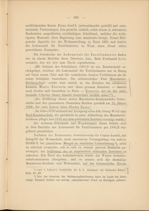 „Mit Schluss des Schuljahres 1881/2 ist ein Zeitabschnitt zurückgelegt, welchen die Lehranstalt für Textilindustrie nur in Bezug auf ihren neuen Titel und die veränderten localen Verhältnisse als ihr erstes Schuljahr bezeichnet. Ihr althistorischer Titel ,Manufactur- Z eichenschul e‘ reicht weit zurück in das Zeitalter der erhabenen Kaiserin Maria Theresia und ihres grossen Kanzlers — damals noch Grafen und Gesandten in Paris — Kaunitz, der als_derJnteL lectuelle Erheber dieser Anstalt bezeichnet werden muss.“ 1 !