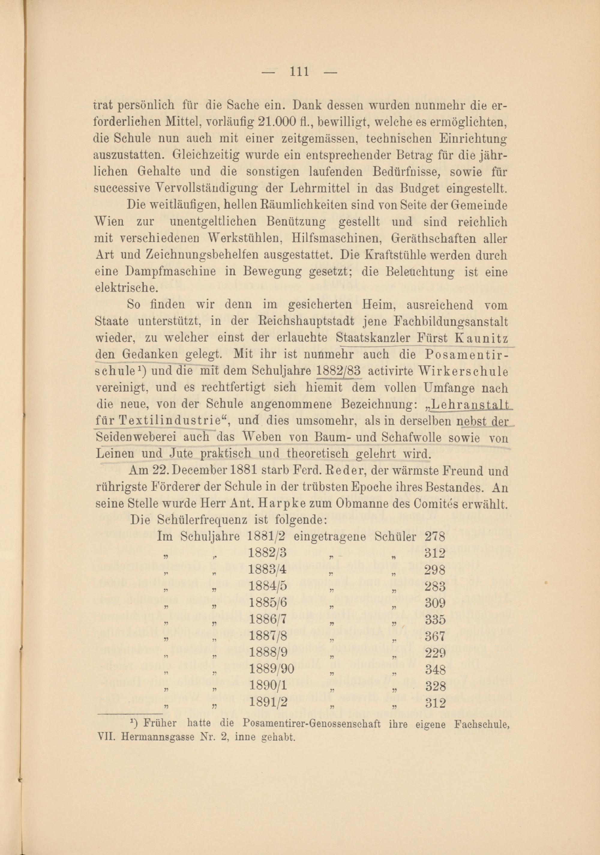 So finden wir denn im gesicherten Heim, ausreichend vom Staate unterstützt, in der Reichshauptstadt jene Fachbildungsanstalt wieder, zu welcher einst der erlauchte Staatskanzler Fürst Kaunitz den Ge dank en gelegt. Mit ihr ist nunmehr auch die Posamentirschule 1 ) und die mit dem Schuljahre 1882/83 activirte Wirkerschule vereinigt, und es rechtfertigt sieh hiemit dem vollen Umfange nach die neue, von der Schule angenommene Bezeichnung: . .Lehranstalt für Textili ndustrie“, und dies umsomehr, als in derselben nebst der Seidenweberei auch das Weben von Baum- und Schafwolle sowie von Leinen und Jute praktisch und theoretisch gelehrt wird.