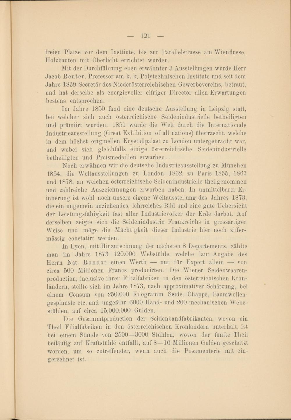 Noch erwähnen wir die deutsche Industrieausstellung zu München 1854, die Weltausstellungen zu London 1862, zu Paris 1855, 1867 und 1878, an welchen österreichische Seidenindustrielle theilgenommen und zahlreiche Auszeichnungen erworben haben. In unmittelbarer Erinnerung ist wohl noch unsere eigene Weltausstellung des Jahres 1873, die ein ungemein anziehendes, lehrreiches Bild und eine gute Üebersicht der Leistungsfähigkeit fast aller Industrie Völker der Erde darbot. Auf derselben zeigte sich die Seidenindustrie Frankreichs in grossartiger Weise und möge die Mächtigkeit dieser Industrie hier noch ziffer- massig constatirt w T erden.