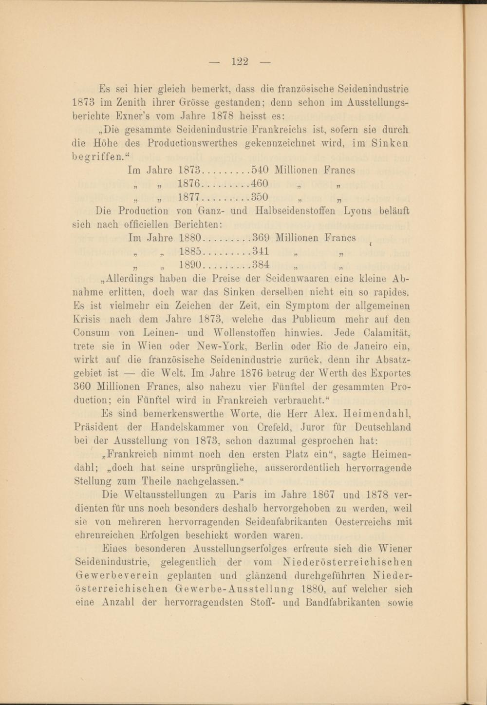 Es sei hier gleich bemerkt, dass die französische Seidenindustrie 1873 im Zenith ihrer Grösse gestanden; denn schon im Ansstellungsberichte Exner’s vom Jahre 1878 heisst es: