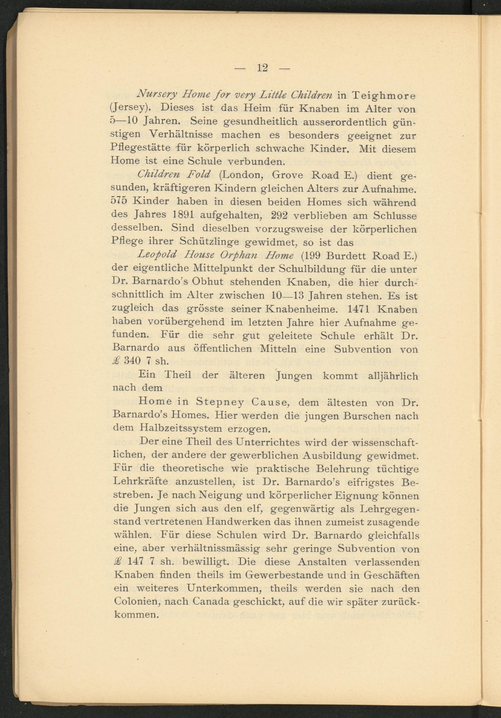 Leopold House Orphan Home (199 Burdett Road E.) der eigentliche Mittelpunkt der Schulbildung für die unter Dr. Barnardos Obhut stehenden Knaben, die hier durch­schnittlich im Alter zwischen 1013 Jahren stehen. Es ist zugleich das grösste seiner Knabenheime. 1471 Knaben haben vorübergehend im letzten Jahre hier Aufnahme ge­funden. Für die sehr gut geleitete Schule erhält Dr. Barnardo aus öffentlichen Mitteln eine Subvention von £ 340 7 sh.