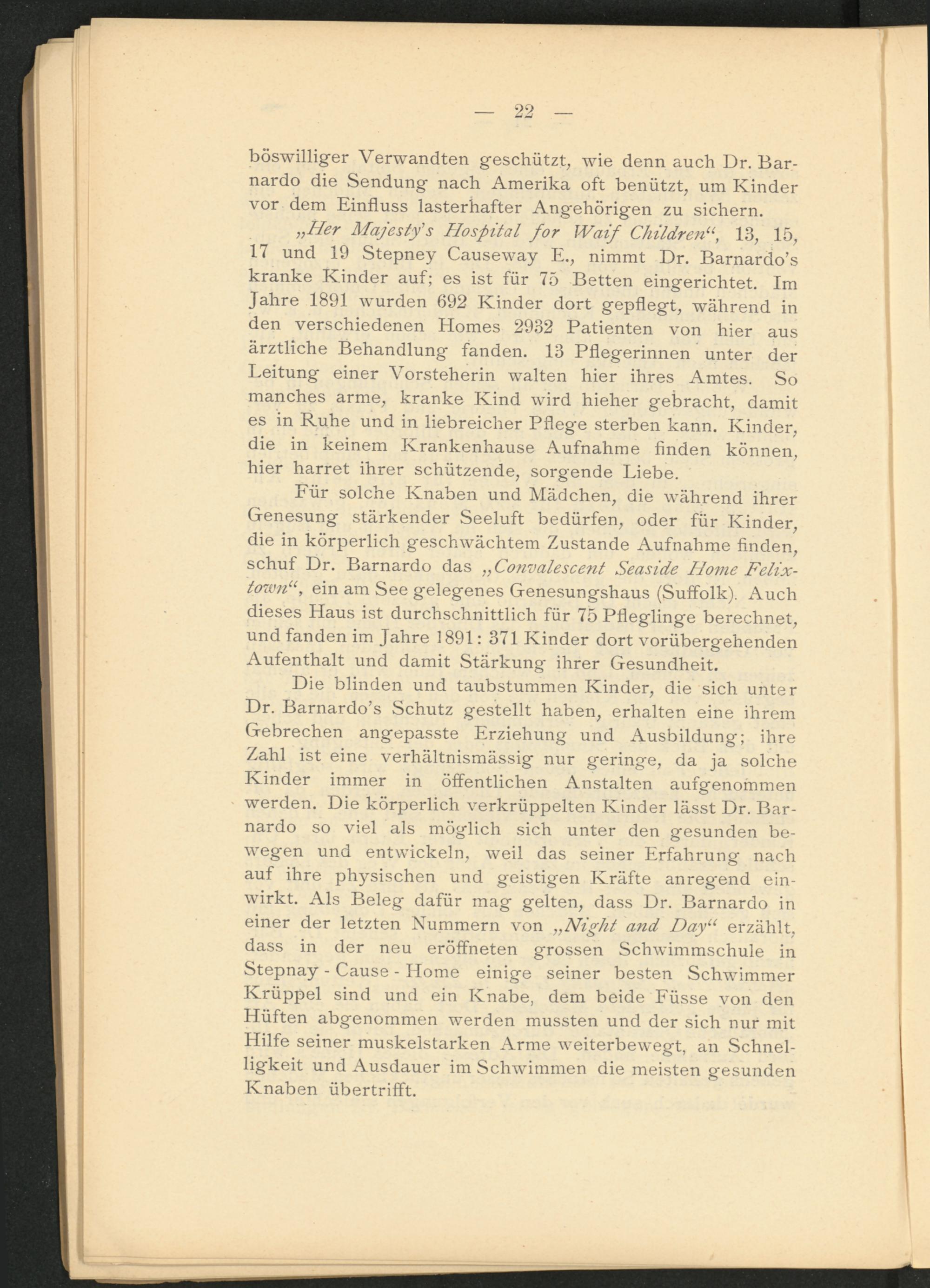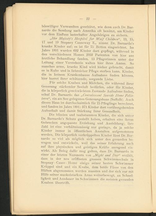 Die blinden und taubstummen Kinder, die sich unter Dr. Barnardo’s Schutz gestellt haben, erhalten eine ihrem Gebrechen angepasste Erziehung und Ausbildung; ihre Zahl ist eine verhältnismässig nur geringe, da ja solche Kinder immer in öffentlichen Anstalten aufgenommen werden. Die körperlich verkrüppelten Kinder lässt Dr. Barnardo so viel als möglich sich unter den gesunden bewegen und entwickeln, weil das seiner Erfahrung nach auf ihre physischen und geistigen Kräfte anreg'end einwirkt. Als Beleg dafür mag gelten, dass Dr. Barnardo in einer der letzten Nummern von „ Night and Day u erzählt, dass in der neu eröffneten grossen Schwimmschule in Stepnay - Cause - Home einige seiner besten Schwimmer Krüppel sind und ein Knabe, dem beide Füsse von den Hüften abgenommen werden mussten und der sich nur mit Hilfe seiner muskelstarken Arme weiterbewegt, an Schnelligkeit und Ausdauer im Schwimmen die meisten gesunden Knaben übertrifft.