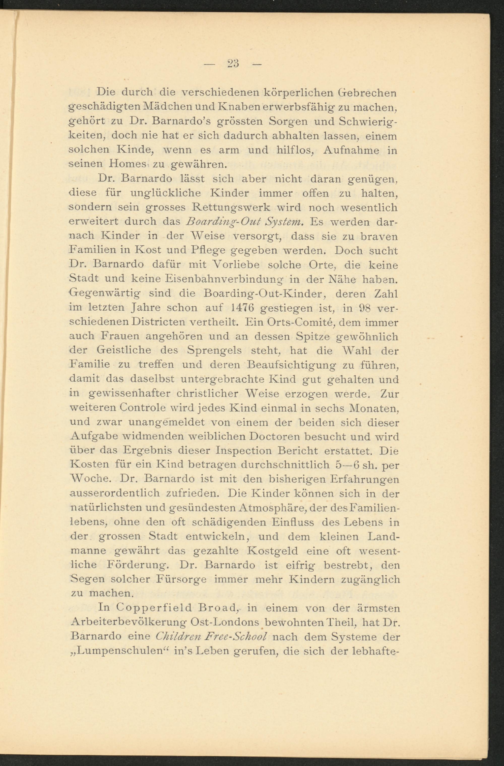 Dr. Barnardo lässt sich aber nicht daran genügen, diese für unglückliche Kinder immer offen zu halten, sondern sein grosses Rettungswerk wird noch wesentlich erweitert durch das Boarding-Out System . Es werden darnach Kinder in der Weise versorgt, dass sie zu braven Familien in Kost und Pflege gegeben werden. Doch sucht Dr. Barnardo dafür mit Vorliebe solche Orte, die keine Stadt und keine Eisenbahnverbindung in der Nähe haben. Gegenwärtig sind die Boarding-Out-Kinder, deren Zahl im letzten Jahre schon auf 1476 gestiegen ist, in 98 verschiedenen Districten vertheilt. Ein Orts-Comite, dem immer auch Frauen angehören und an dessen Spitze gewöhnlich der Geistliche des Sprengels steht, hat die Wahl der Familie zu treffen und deren Beaufsichtigung zu führen, damit das daselbst untergebrachte Kind gut gehalten und in gewissenhafter christlicher Weise erzogen werde. Zur weiteren Controle wird jedes Kind einmal in sechs Monaten, und zwar unangemeldet von einem der beiden sich dieser Aufgabe widmenden weiblichen Doctoren besucht und wird über das Ergebnis dieser Inspection Bericht erstattet. Die Kosten für ein Kind betragen durchschnittlich 5—6 sh. per Woche. Dr. Barnardo ist mit den bisherigen Erfahrungen ausserordentlich zufrieden. Die Kinder können sich in der natürlichsten und gesündesten Atmosphäre, der des Familienlebens, ohne den oft schädigenden Einfluss des Lebens in der grossen Stadt entwickeln, und dem kleinen Landmanne gewährt das gezahlte Kostgeld eine oft wesentliche Förderung. Dr. Barnardo ist eifrig bestrebt, den Segen solcher Fürsorge immer mehr Kindern zugänglich zu machen.