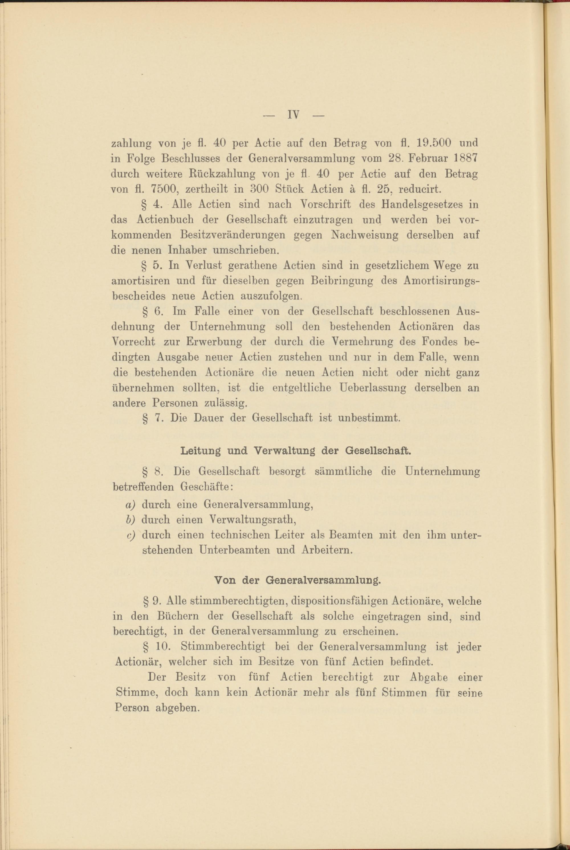 zalilung von je fl. 40 per Actie auf den Betrag von fl. 19.500 und in Folge Beschlusses der Generalversammlung vom 28. Februar 1887 durch weitere Rückzahlung von je fl 40 per Actie auf den Betrag von fl. 7500, zertheilt in 300 Stück Actien ä fl. 25, reducirt.