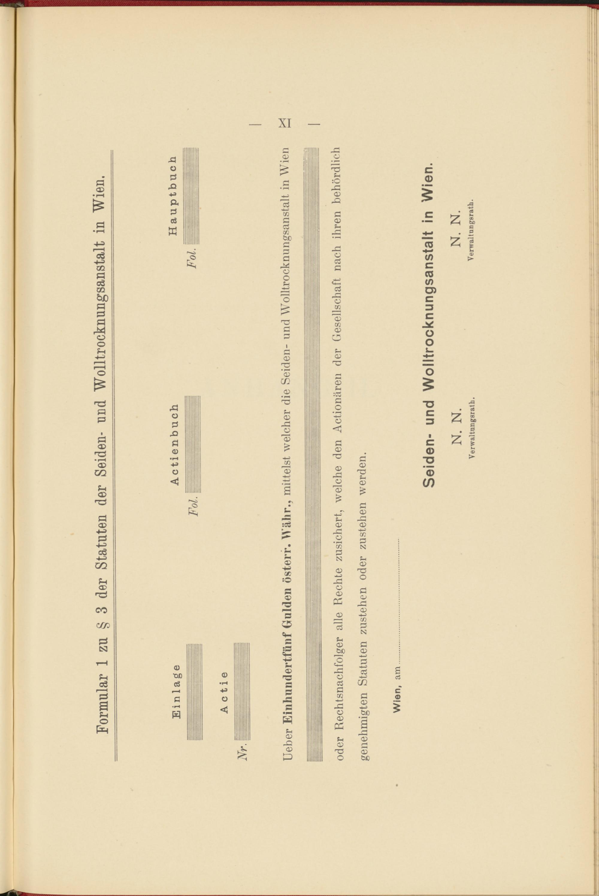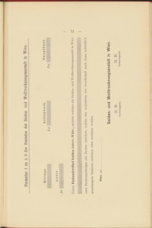 Formular 1 zu § 3 der Statuten der Seiden- und Wolltrocknungsanstalt in Wien.