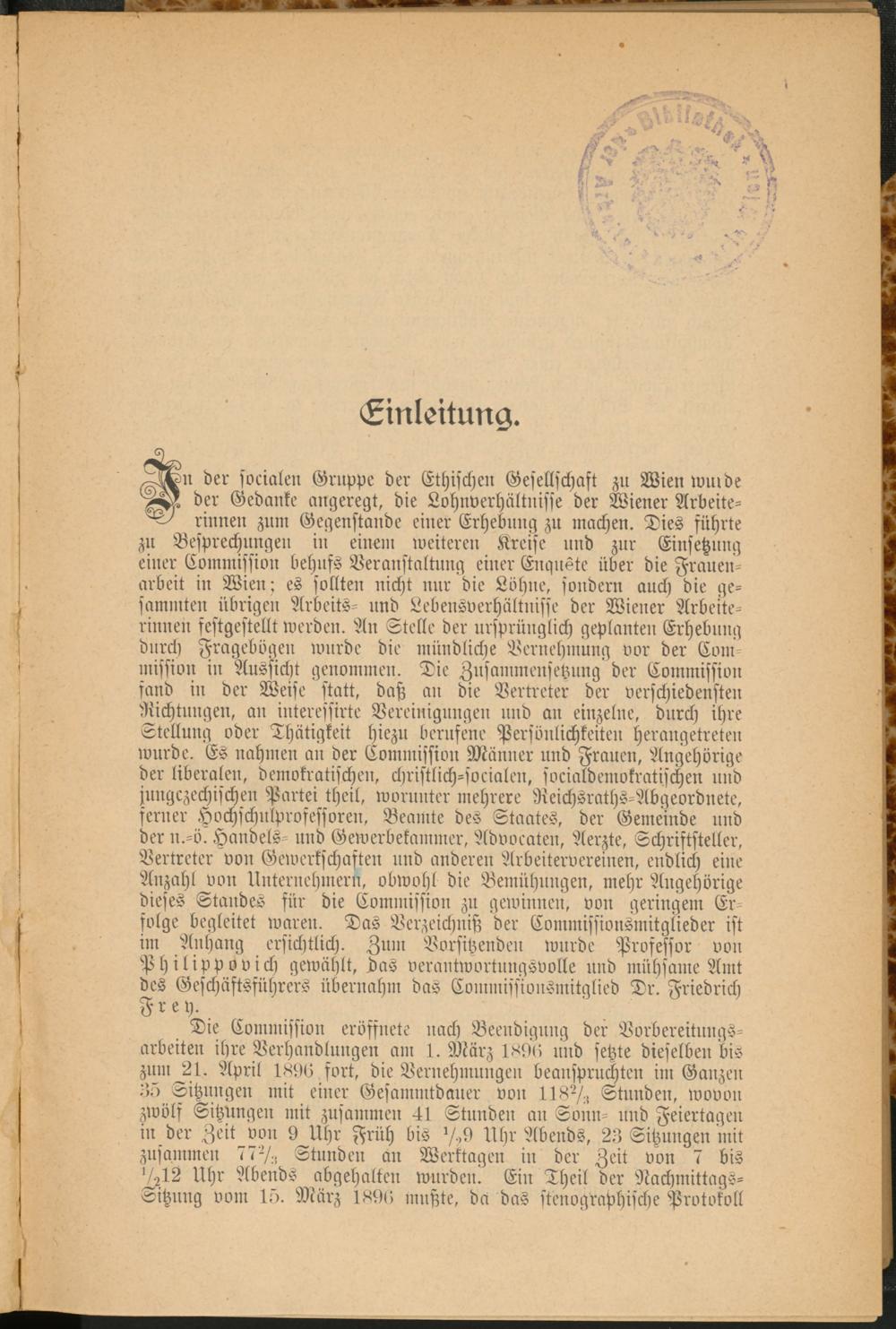 der socialen Gruppe der Ethischen Gesellschaft zu Wien wmde der Gedanke angeregt, die Lohnverhältnisse der Wiener Arbeite- rinnen zunl Gegenstände einer Erhebung zu machen. Dies führte zu Besprechungen in einem weiteren Kreise und zur Einsetzung einer Commission behnfs Veranstaltung einer Enquete über die Frauenarbeit in Wien; es sollten nicht nur die Lohne, sondern auch die gesummten übrigen Arbeits- und Lebensverhältnisse der Wiener Arbeiterinnen festgestellt werden. An Stelle der ursprünglich geplanten Erhebung durch Fragebögen wurde die mündliche Vernehmung vor der Com mission in Aussicht genommen. Die Zusammensetzung der Commission fand in der Weise statt, daß an die Vertreter der verschiedensten Richtungen, an iuteressirte Vereinigungen und an einzelne, durch ihre Stellung oder Thätigkeit hiezu berufene Persönlichkeiten herangetreten wurde. Es nahmen an der Commission Männer und Frauen, Angehörige der liberalen, demokratischen, christlich-socialen, socialdemokratischen und jungczechischen Partei theil, worunter mehrere Reichsraths-Abgeordnete, ferner Hochschulprosessoren, Beamte des Staates, der Gemeinde und der n.-ö. Handels- und Gewerbekammer, Advocaten, Aerzte, Schriftsteller, Vertreter von Gewerkschaften und anderen Arbeitervereinen, endlich eine Anzahl von Unternehmern, obwohl die Bemühungen, mehr Angehörige dieses Standes für die Commission zu gewinnen, von geringem Erfolge begleitet waren. Das Verzeichniß der Commissionsmitglieder ist im Anhang ersichtlich. Zum Vorsitzenden wurde Professor von Philippovich gewühlt, das verantwortungsvolle und mühsame Amt des Geschäftsführers übernahm das Connnissionsmitglied Dr. Friedrich Frey.