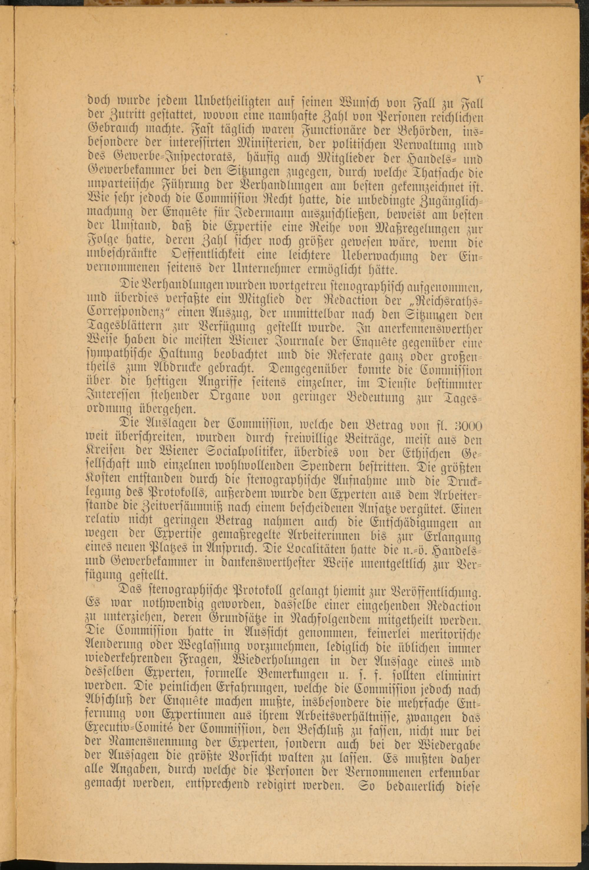 Die Auslagen der Commission, welche den Betrag von sl. :>0> >0 weit überschreiten, wurden durch freiwillige Beiträge, meist aus den Kreisen der Wiener Soeialpolitiker, überdies von der Ethischen Gesellschaft und einzelnen wohlwollenden Spendern bestritten. Die größten Kosten entstanden durch die stenographische Ausnahme und die Drucklegung des Protokolls, außerdem wurde den Experten aus dem Arbeiterstande die Zeitversäumniß nach einem bescheidenen Ansätze vergütet. Einen relativ nicht geringen Betrag nahmen auch die Entschädigungen an wegen der Expertise gemaßregelte Arbeiterinnen bis zur Erlangung eines neuen Platzes in Anspruch. Die LocalitÜten hatte die n.-ö. Handelsund Gewerbekammer in dankenswerthester Weise unentgeltlich zur Verfügung gestellt.