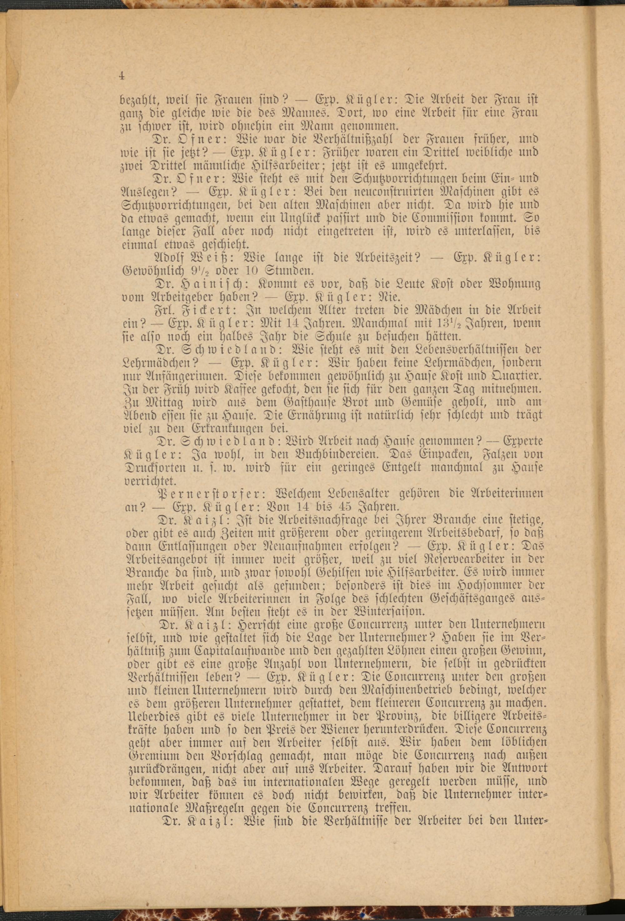 Tr. Schwiedland: Wie steht es mit den Lebensverhältnissen der Lehrmädchen? Exp. Kügler: Wir haben keine Lehrmädchen, sondern nur Anfängerinnen. Diese bekommen gewöhnlich zu Hause Kost und Quartier. In der Früh wird Kaffee gekocht, den sie sich für den ganzen Tag mitnehmen. Zu Mittag wird aus dem Gasthause Brot und Gemüse geholt, und am Abend essen sie zu Hanse. Die Ernährung ist natürlich sehr schlecht und trägt viel zu den Erkrankungen bei.
