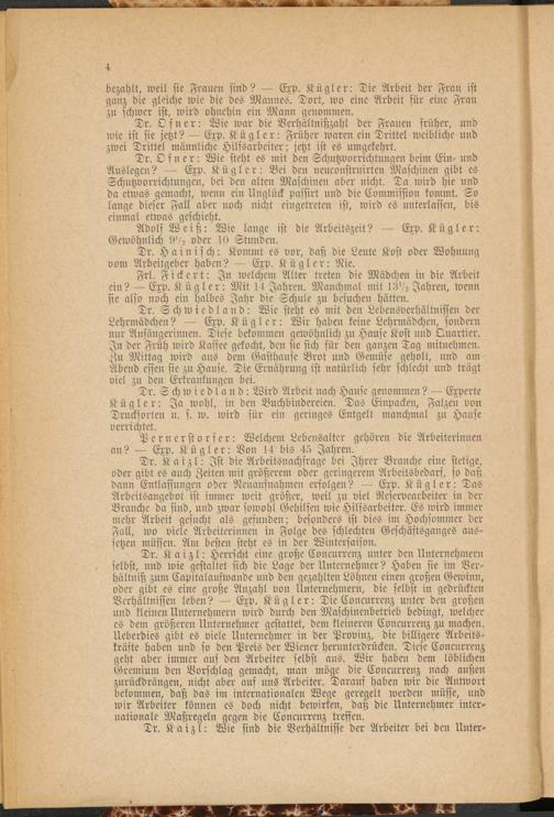 Frl. Fickert: In welchem Alter treten die Mädchen in die Arbeit ein? Exp. Kügler: Mit 14 Jahren. Manchmal mit l.N /2 Jahren, wenn sie also noch ein halbes Jahr die schule zu besuchen hätten.