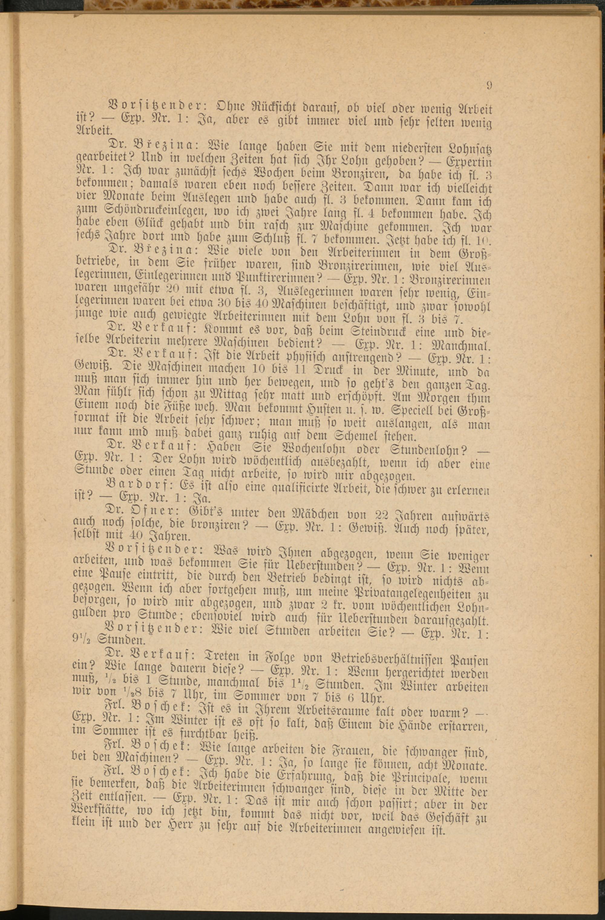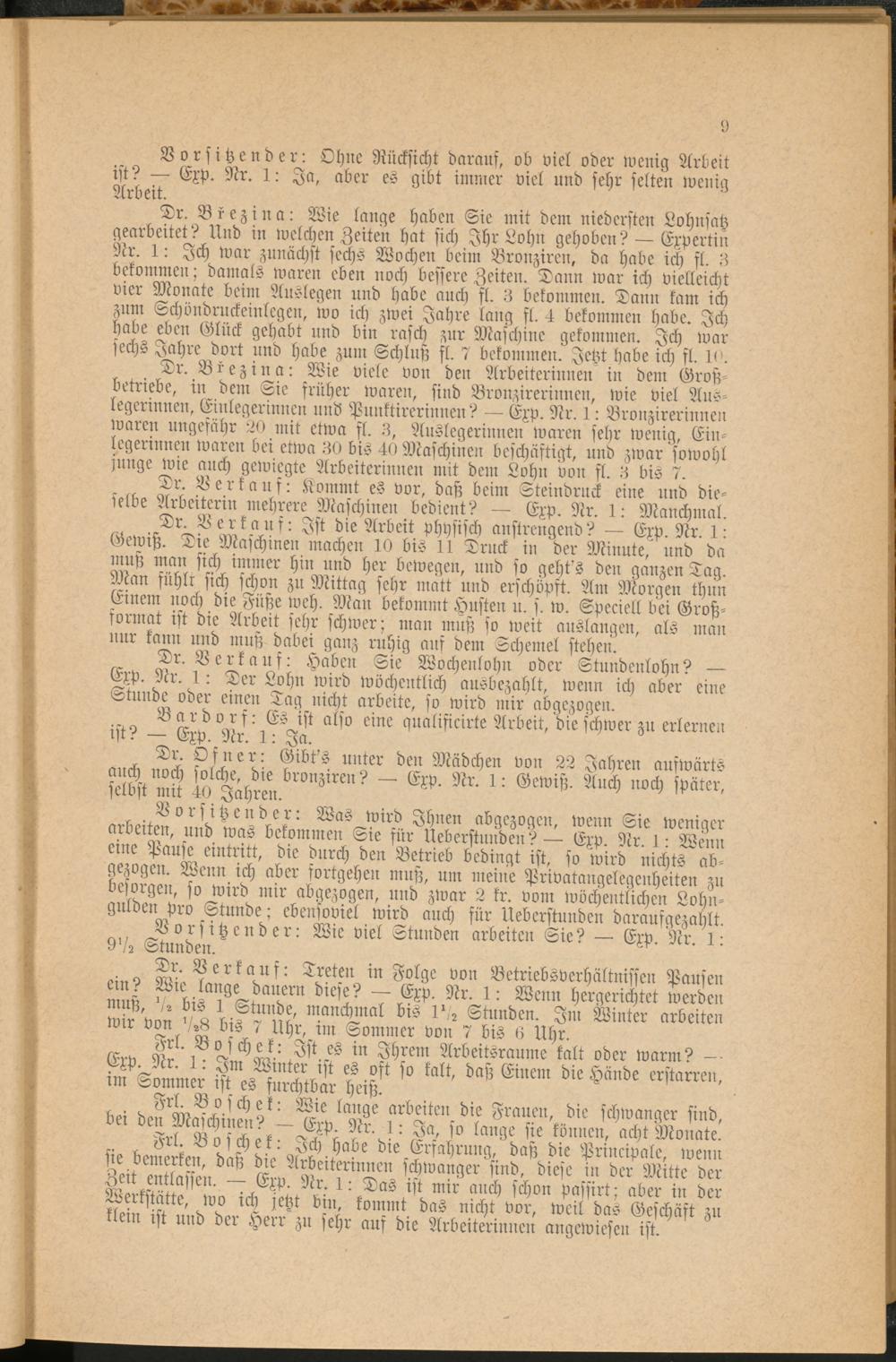 Dr. Brezina: Wie viele von den Arbeiterinnen in dem Großbetriebe, in dem Sie früher waren, sind Bronzirerinnen, wie viel Aus- legerinnen, Einlegerinnen und Punktirerinnen? — Exp. Nr. 1: Bronzirerinnen waren ungefähr 20 mit etwa fl. 3, Auslegerinnen waren sehr wenig, Einlegerinnen waren bei etwa 30 bis 40 Maschinen beschäftigt, und zwar sowohl junge wie auch gewiegte Arbeiterinnen mit dem Lohn von fl. 3 bis 7.