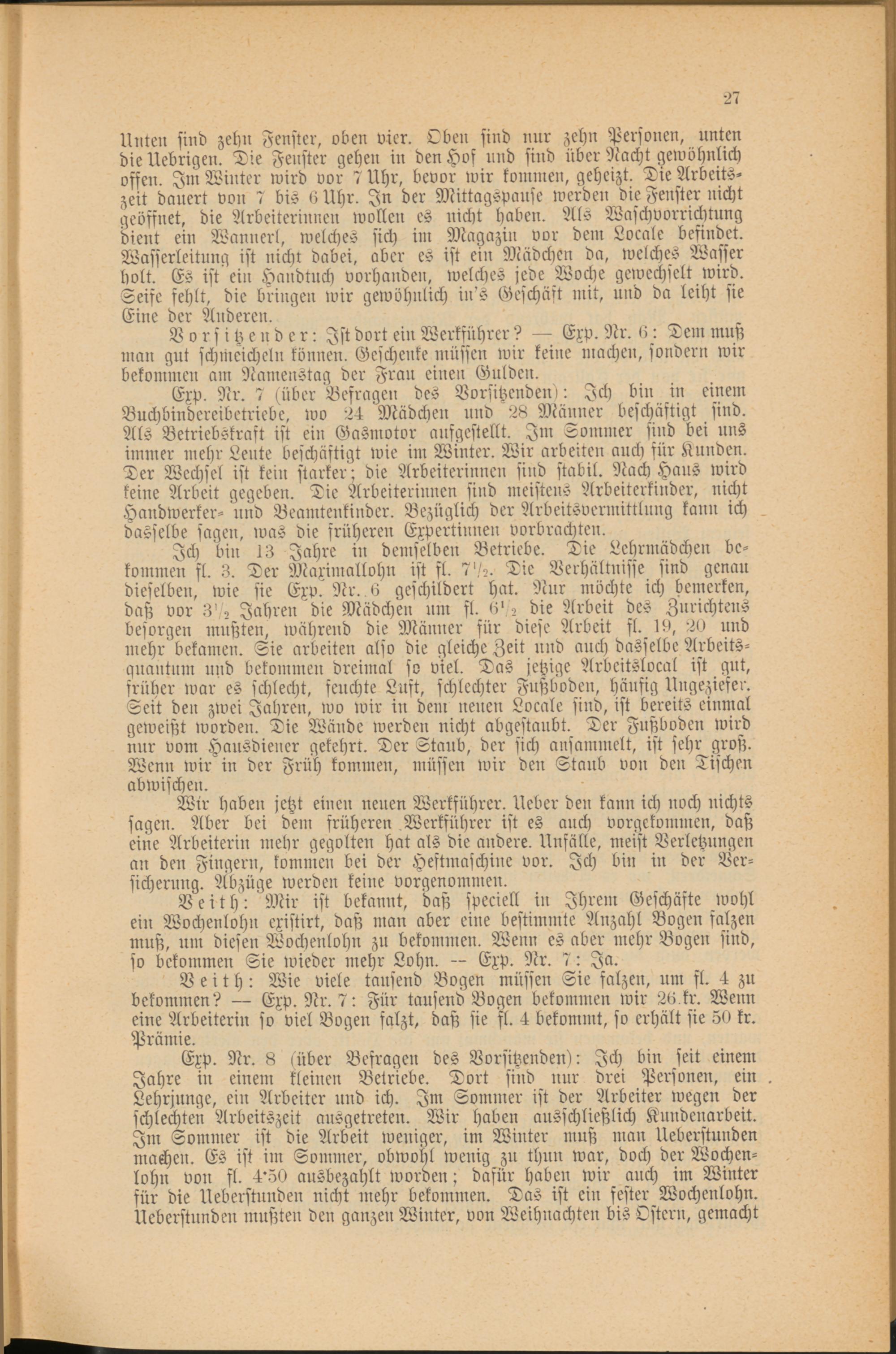 Exp. Nr. 7 (über Befragen des Vorsitzenden!: Ich bin in einem Buchbindereibetriebe, wo 24 Mädchen und 28 Männer beschäftigt sind. Als Betriebskraft ist ein Gasmotor aufgestellt. Im Sommer sind bei uns immer mehr Leute beschäftigt wie im Winter. Wir arbeiten auch für Kunden. Der Wechsel ist kein starker; die Arbeiterinnen sind stabil. Nach Haus wird keine Arbeit gegeben. Die Arbeiterinnen sind meistens Arbeiterkinder, nicht Handwerker- und Beamtenkinder. Bezüglich der Arbeitsvermittlung kann ich dasselbe sagen, was die früheren Expertinnen vorbrachten.