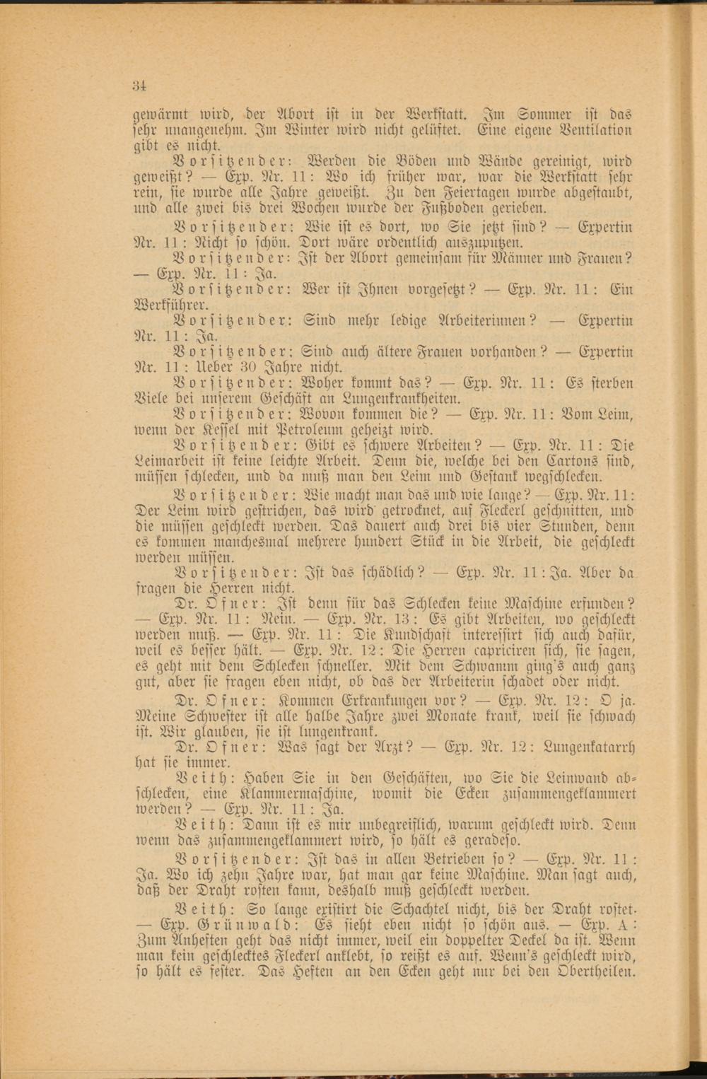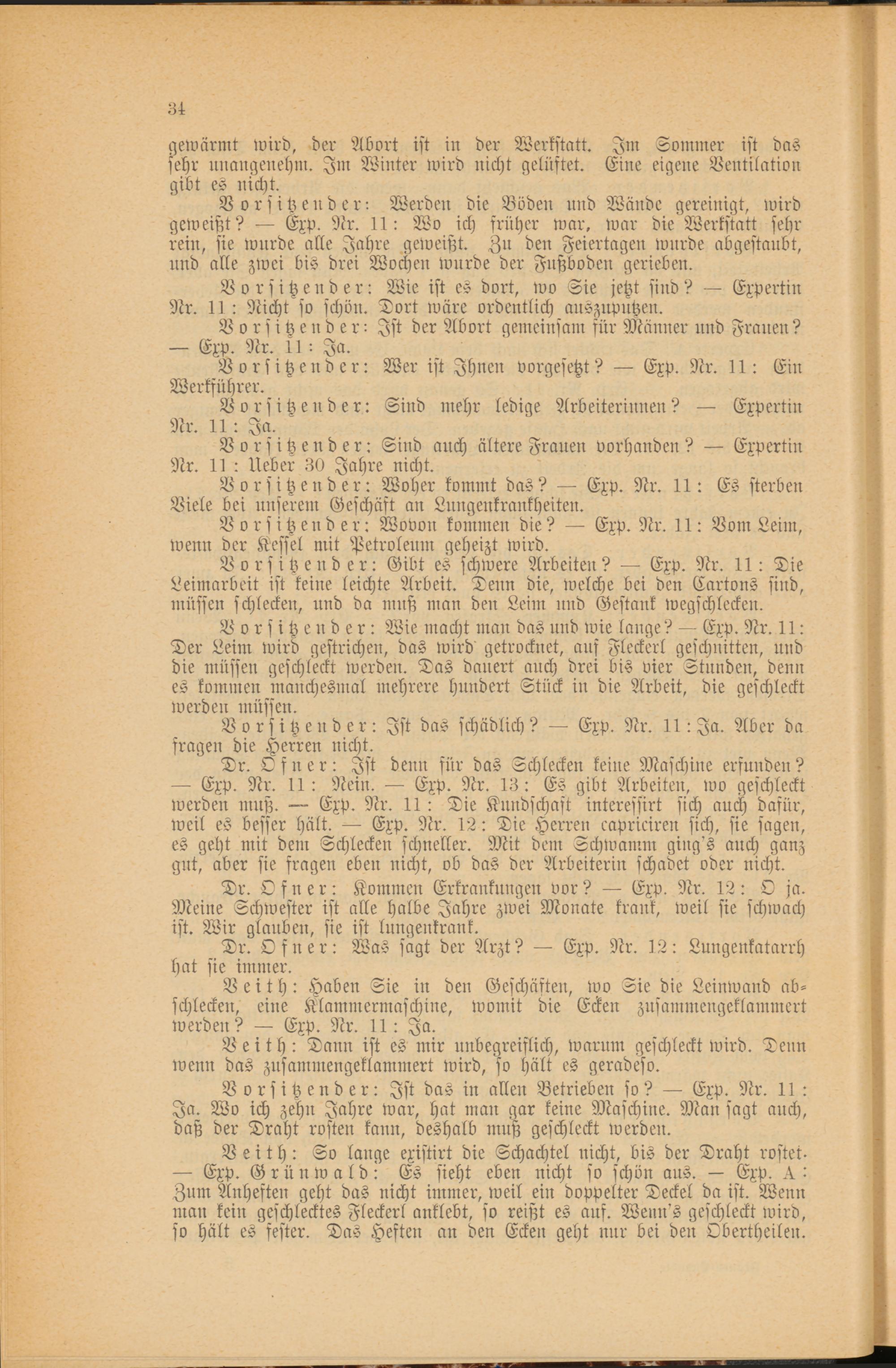 Vorsitzender: Gibt es schwere Arbeiten? — Exp. Nr. 11: Die Leimarbeit ist keine leichte Arbeit. Denn die, welche bei den Cartons sind, müssen schlecken, und da mnß man den Leim und Gestank wegschlecken.