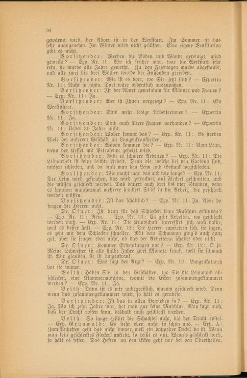 Vorsitzender: Werden die Böden und Wände gereinigt, wird geweißt? — Exp. Nr. 11: Wo ich früher war. war die Werkstatt sehr rein, sie wurde alle Jahre geweißt. Zu den Feiertagen wurde abgestaubt, und alle zwei bis drei Wochen wurde der Fußboden gerieben.