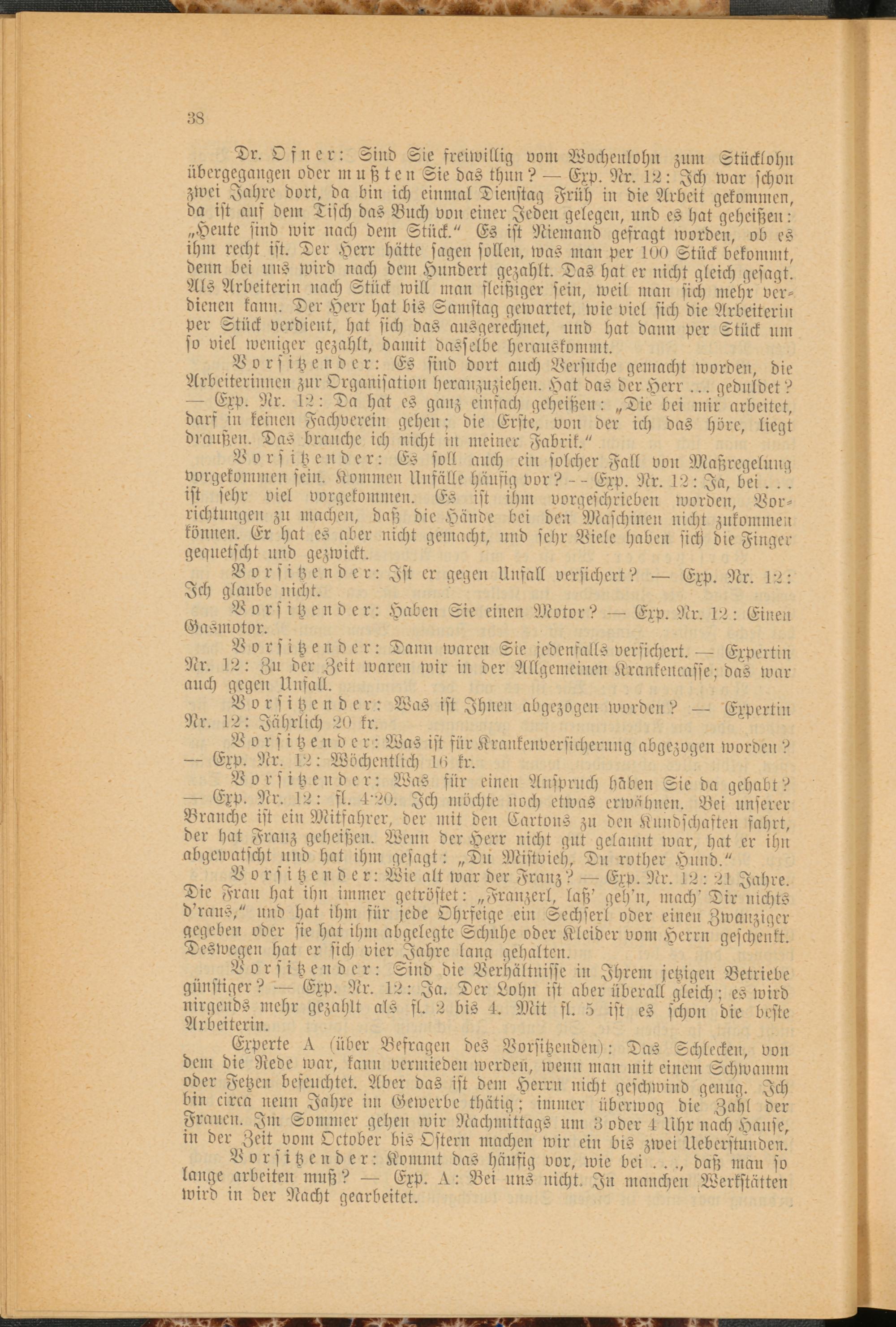 Vorsitzender: Sind die Verhältnisse in Ihrem jetzigen Betriebe günstiger?Exp. Nr. 12: Ja. Der Lohn ist aber überall gleich; es wird nirgends mehr gezahlt als sl. 2 bis 4. Mit sl. 5 ist es schon die beste Arbeiterin.