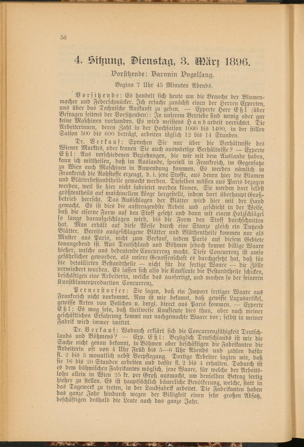 Vorsitzende: Es handelt sich heute um die Branche der Blumenmacher und Federschmücker. Ich ersuche zunächst einen der Herren Experten, uns über das Technische Auskunft zu geben. — Experte Herr Eßl «über Befragen seitens der Vorsitzenden): In unserem Betriebe sind wenig oder gar keine Maschinen vorhanden. Es wird meistens Hand arbeit verrichtet. Die Arbeiterinnen, deren Zahl in der Hochsaison 1000 bis 1400, in der stillen Saison 500 bis 600 beträgt, arbeiten täglich 12 bis 14 Stunden.