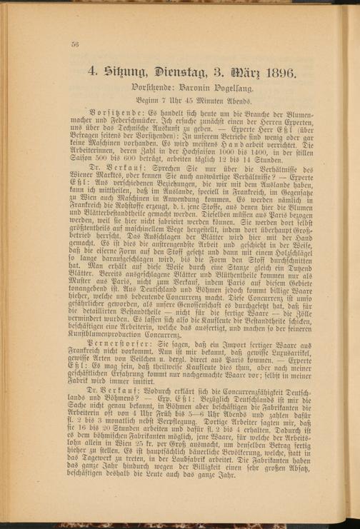 Pernerstorfer: Sie sagen, daß ein Import fertiger Waare aus Frankreich nicht vorkommt. Nun ist mir bekannt, daß gewisse Luxusartikel, gewisse Arten von Veilchen u. dergl. direct aus Paris kommen. — Experte Eßl: Es mag sein, daß theilweise Kaufleute dies thun, aber nach meiner geschäftlichen Erfahrung kommt nur nachgemachte Waare vor; selbst in meiner Fabrik wird immer imitirt.