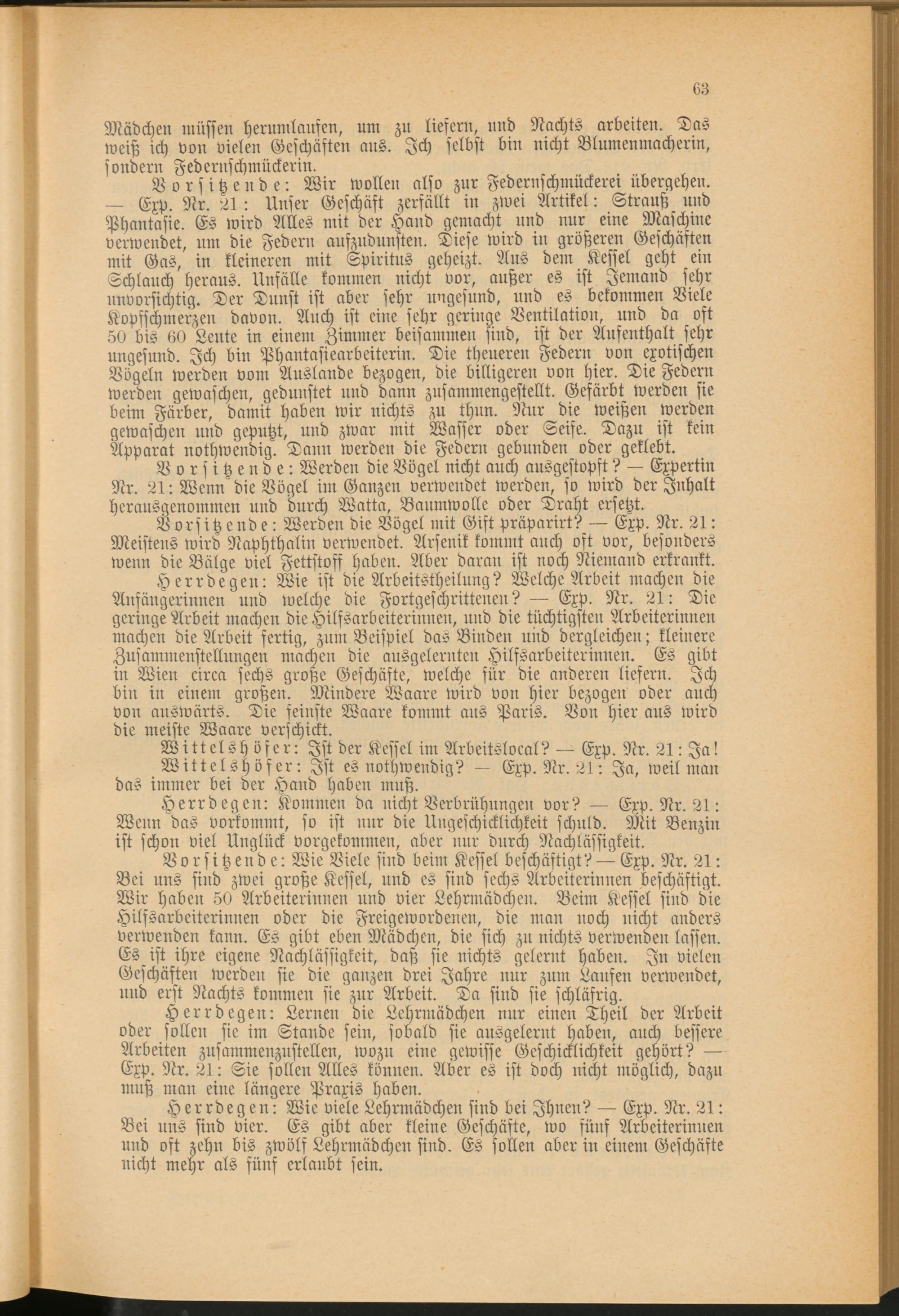 Vorsitzende: Wie Viele sind beim Kessel beschäftigt? — Exp. Nr. 21: Bei uns sind°zwei große Kessel, und es sind sechs Arbeiterinnen beschäftigt. Wir haben 50 Arbeiterinnen und vier Lehrmädchen. Beim Kessel sind die Hilfsarbeiterinnen oder die Freigewordenen, die man noch nicht anders verwenden kann. Es gibt eben Mädchen, die sich zu nichts verwenden laffen. Es ist ihre eigene Nachlässigkeit, daß sie nichts gelernt haben. In vielen Geschäften werden sie die ganzen drei Jahre nur zum Laufen verwendet, und erst Nachts kommen sie zur Arbeit. Da sind sie schläfrig.