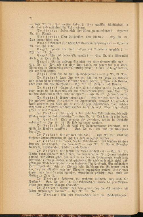 Engel: Warum gehören Sie nicht jetzt einer Krankenkasse an? — Exp. Nr. 23: Weil wir nur einen Arzt haben, der gehört für ganz Wien. Wenn eine in Simmering oder Ottakring wohnt, so kann sie lange warten, bis der Arzt kommt.