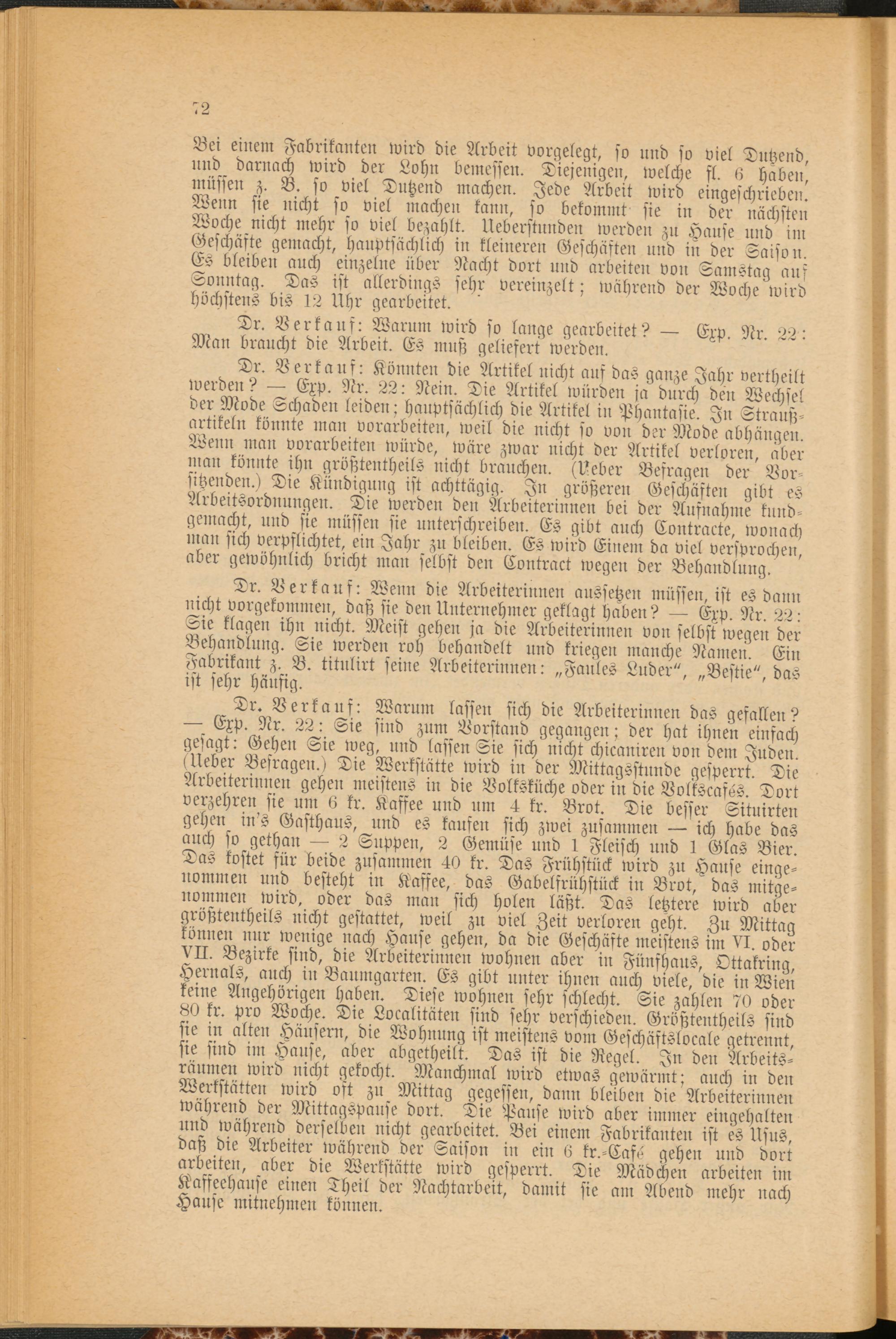 Dr. Verkauf: Warum lassen sich die Arbeiterinnen das gefallen? Exp. Nr. 22: «sie sind zum Vorstand gegangen; der hat ihnen einfach gesagt: Gehen Sie weg, und lassen Sie sich nicht chicaniren von dem Juden. (Ueber Befragen.) Die Werkstätte wird in der Mittagsstunde gesperrt. Die Arbeiterinnen gehen meistens in die Volksküche oder in die Volkscasös. Dort verzehren sie um 6 kr. Kaffee und um 4 kr. Brot. Die besser Situirten gehen in's Gasthaus, und es kaufen sich zwei zusammen ich habe das auch so gethan 2 Suppen, 2 Gemüse und 1 Fleisch und 1 Glas Bier. Das kostet für beide zusammen 40 kr. Das Frühstück wird zu Hause einge­nommen und besteht in Kaffee, das Gabelfrühstück in Brot, das mitge­nommen wird, oder das man sich holen läßt. Das letztere wird aber größtentheils nicht gestattet, weil zu viel Zeit verloren geht. Zu Mittag können nur wenige nach Hause gehen, da die Geschäfte meistens im VI. oder VII. Bezirke sind, die Arbeiterinnen wohnen aber in Fünshaus, Ottakring, Hernals, auch in Baumgarten. Es gibt unter ihnen auch viele, die in Wien keine Angehörigen haben. Diese wohnen sehr schlecht. Sie zahlen 70 oder 80 kr. pro Woche. Die Lokalitäten sind sehr verschieden. Größtentheils sind sie in alten Häusern, die Wohnung ist meistens vom Geschäftslocale getrennt, sie sind im Hause, aber abgetheilt. Das ist die Regel. In den Arbeits- rüumen wird nicht gekocht. Manchmal wird etwas gewärmt; auch in den Werkstätten wird oft zu Mittag gegessen, dann bleiben die Arbeiterinnen während der Mittagspause dort. Die Pause wird aber immer eingehalten und während derselben nicht gearbeitet. Bei einem Fabrikanten ist es Usus, daß die Arbeiter während der Saison in ein 6 kr.-Cafe gehen und dort arheiten, aber die Werkstätte wird gesperrt. Die Mädchen arbeiten im Kaffeehause einen Theil der Nachtarbeit, damit sie am Abend mehr nach Hause mitnehmen können.