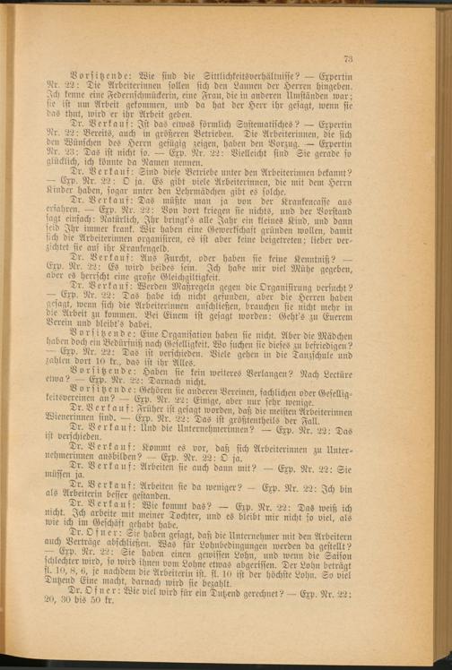 — Exp. Nr. 22: Sie haben einen gewissen Lohn, und wenn die Saison schlechter wird, so wird ihnen vom Lohne etwas abgerissen. Der Lohn beträgt fl. 10, 8, 6, je nachdem die Arbeiterin ist. fl. 10 ist der höchste Lohn. So viel Dutzend Eine macht, darnach wird sie bezahlt.