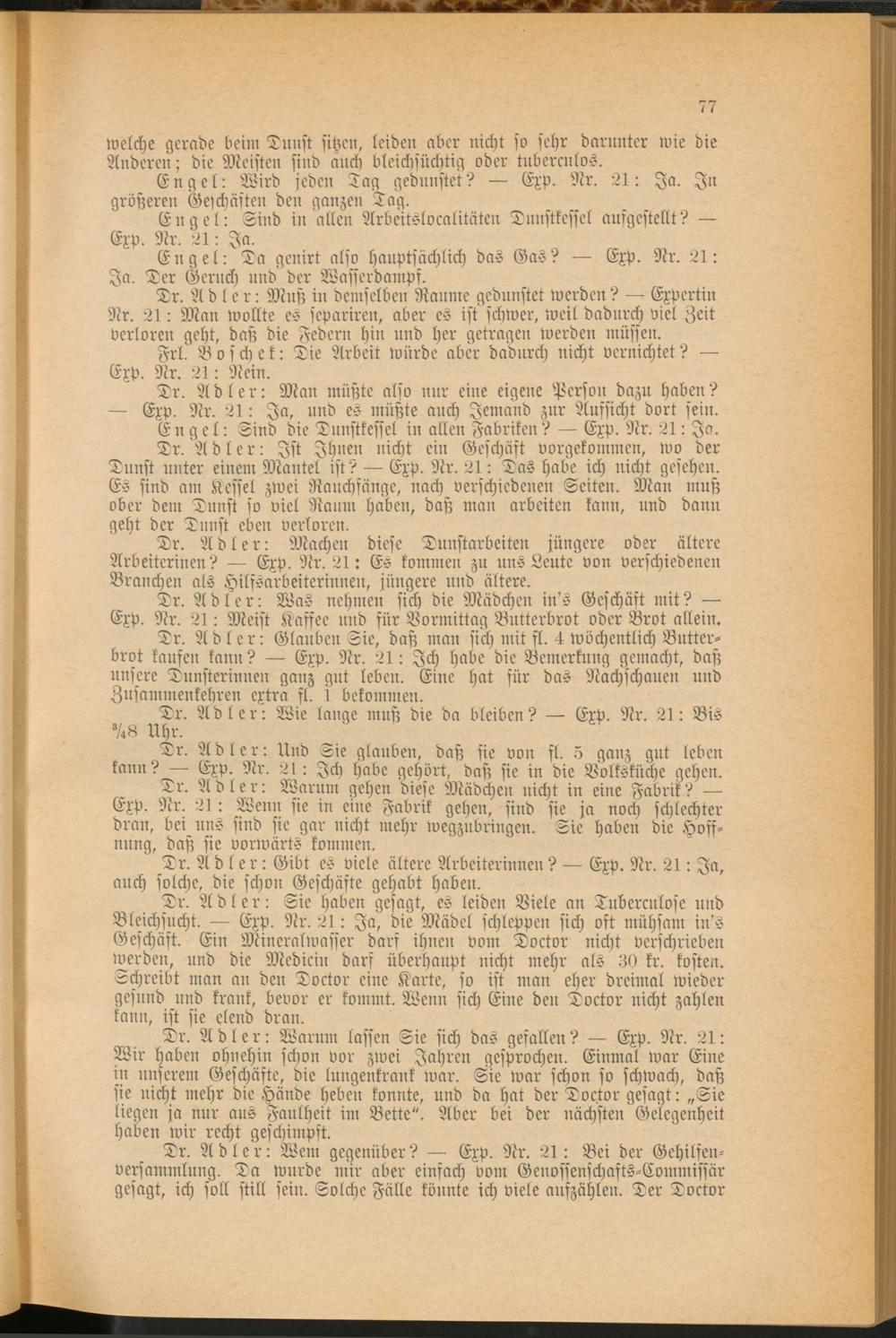 Tr. Adler: Sie haben gesagt, es leiden Viele an Tubercnlose und Bleichsucht. — Exp. Nr. 21 : Ja, die Mädel schleppen sich oft mühsam in's Geschäft. Ein Mineralwasser darf ihnen vom Doctor nicht verschrieben werden, und die Medicin darf überhaupt nicht mehr als 30 kr. kosten. Schreibt man an den Doctor eine Karte, so ist man eher dreimal wieder gesund und krank, bevor er kommt. Wenn sich Eine den Doctor nicht zahlen kann, ist sie elend dran.