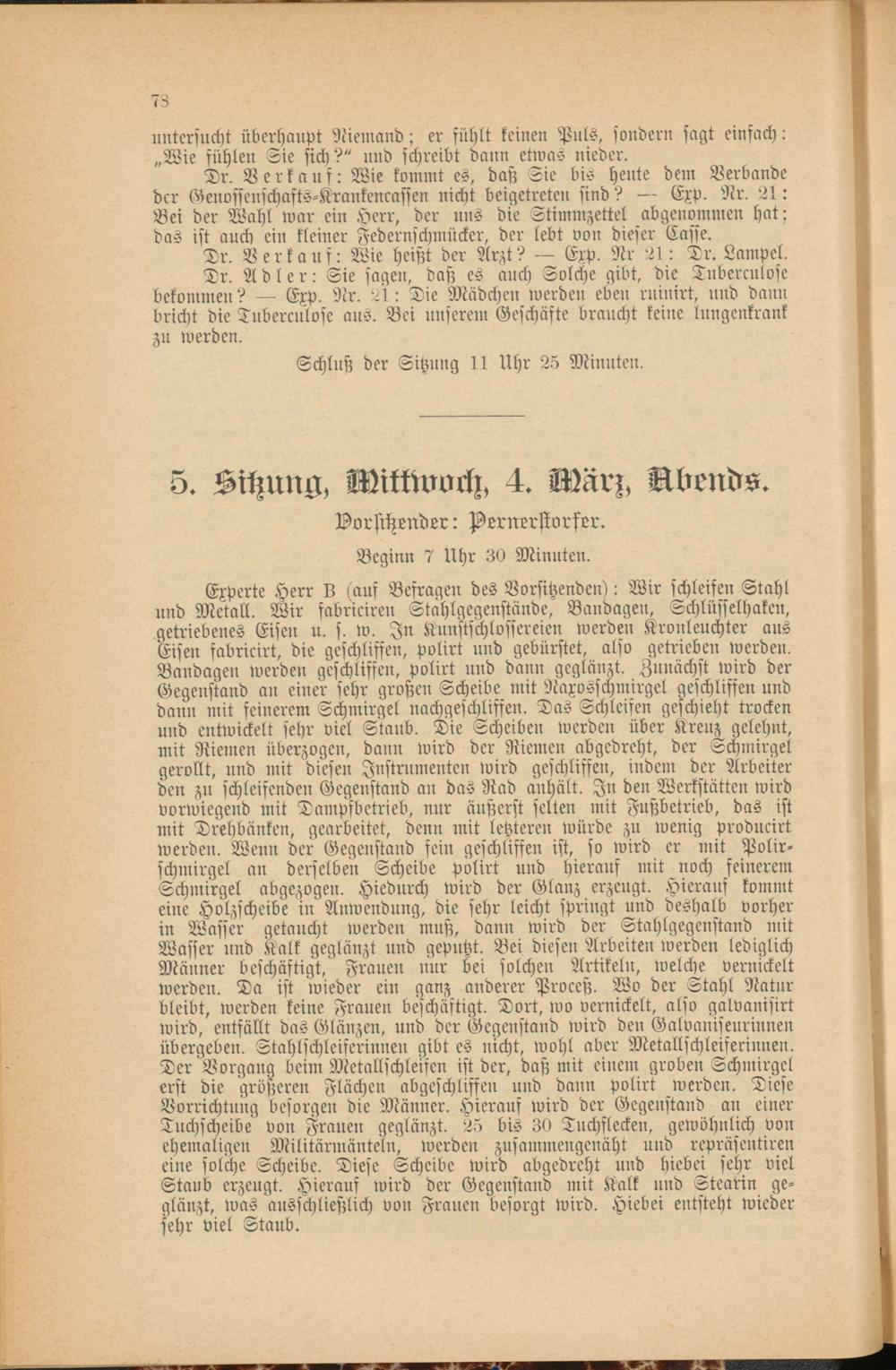 Dr. Adler: Sie sagen, daß es auch Solche gibt, die Tuberkulose bekommen? — Exp. Nr. 21: Die Mädchen werden eben ruinirt, und dann bricht die Tuberkulose aus. Bei unserem Geschäfte braucht keine lungenkrank zu werden.