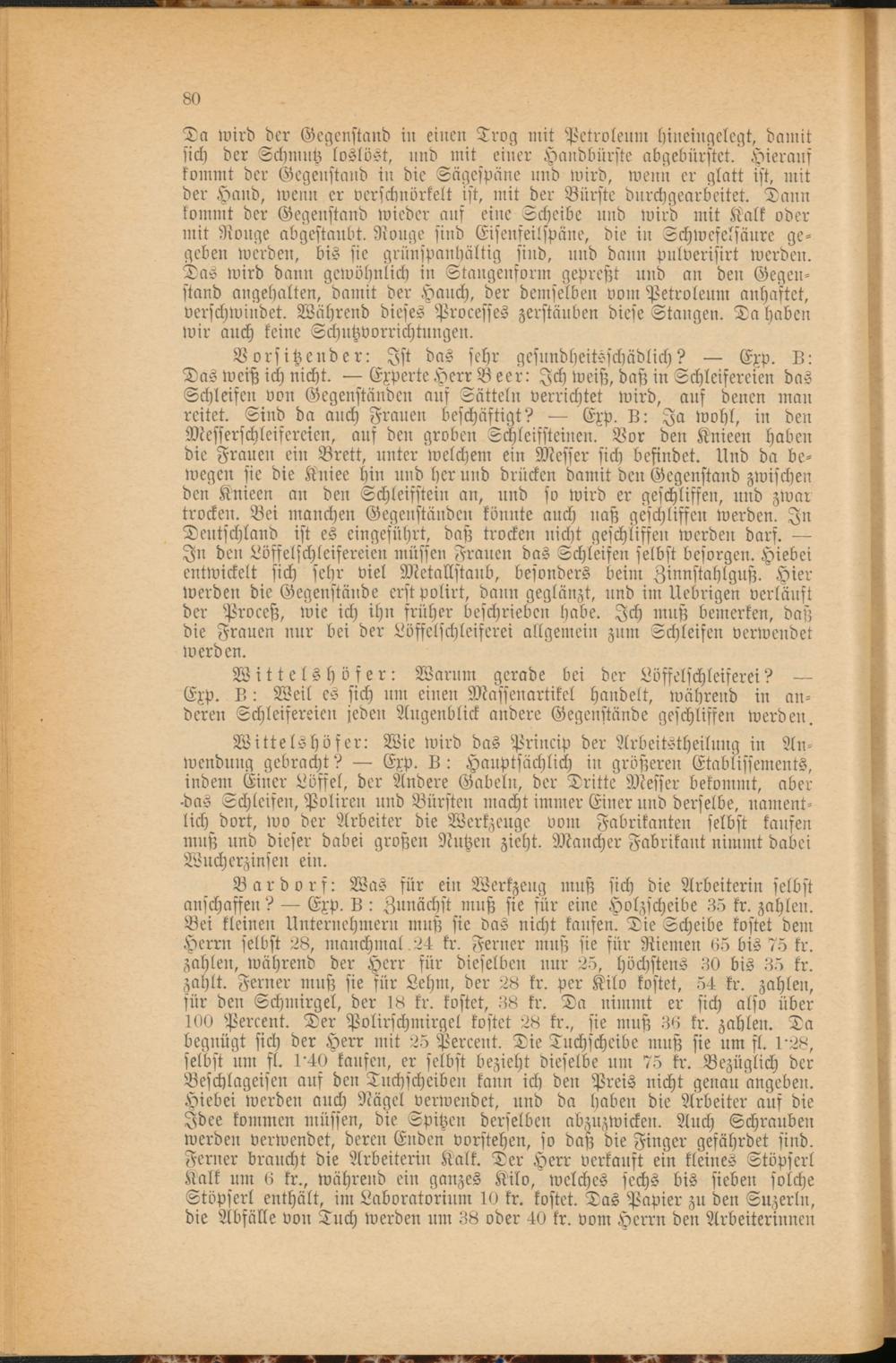 Vorsitzender: Ist das sehr gesundheitsschädlich? — Exp. L: Das weiß ich nicht. — Experte Herr B eer: Ich weiß, daß in Schleifereien das Schleifen von Gegenständen aus Sätteln verrichtet wird, aus denen man reitet. Sind da auch Frauen beschäftigt? — Exp. 8: Ja wohl, in den Messerschleifereien, auf den groben Schleifsteinen. Vor den Knieen haben die Frauen ein Brett, unter welchem ein Messer sich befindet. Und da bewegen sie die Kniee hin und her und drücken damit den Gegenstand zwischen den Knieen an den Schleifstein an, und so wird er geschliffen, und zwar trocken. Bei manchen Gegenständen könnte auch naß geschliffen werden. In Deutschland ist es eingeführt, daß trocken nicht geschlissen werden darf. — In den Löffelschleifereien müssen Frauen das Schleifen selbst besorgen. Hiebei entwickelt sich sehr viel Metallstaub, besonders beim Zinnstahlguß. Hier werden die Gegenstände erst polirt, dann geglänzt, und im Uebrigen verläuft der Proceß, wie ich ihn früher beschrieben habe. Ich mnß bemerken, daß die Frauen nur bei der Löffelschleiferei allgemein zum Schleifen verwendet werden.