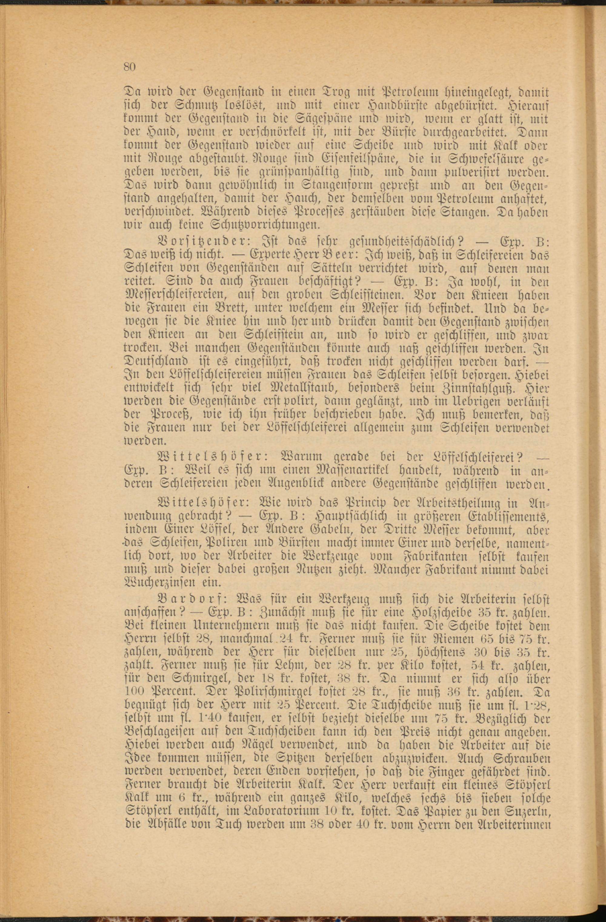 Bardors: Was für ein Werkzeug muß sich die Arbeiterin selbst anschaffen? — Exp. L: Zunächst muß sie für eine Holzscheibe 85 kr. zahlen. Bei kleinen Unternehmern muß sie das nicht kaufen. Die Scheibe kostet dem Herrn selbst 28, manchmal 24 kr. Ferner muß sie für Riemen 65 bis 75 kr. zahlen, während der Herr für dieselben nur 25, höchstens 80 bis 85 kr. zahlt. Ferner muß sie für Lehn:, der 28 kr. per Kilo kostet, 54 kr. zahlen, für den Schmirgel, der 18 kr. kostet, 88 kr. Da nimmt er sich also über 100 Percent. Der Polirschmirgel kostet 28 kr., sie muß 86 kr. zahlen. Da begnügt sich der Herr mit 25 Percent. Die Tuchscheibe muß sie um sl. 1-28, selbst um fl. 1-40 kaufen, er selbst bezieht dieselbe um 75 kr. Bezüglich der Beschlageisen aus den Tuchscheiben kann ich den Preis nicht genau angeben. Hiebei werden auch Nägel verwendet, und da haben die Arbeiter aus die Idee kommen müssen, die Spitzen derselben abzuzwicken. Auch Schrauben werden verwendet, deren Enden vorstehen, so daß die Finger gefährdet sind. Ferner braucht die Arbeiterin Kalk. Der Herr verkauft ein kleines Stöpserl Kalk um 6 kr., während ein ganzes Kilo, welches sechs bis sieben solche Stöpserl enthält, im Laboratorium 10 kr. kostet. Das Papier zu den Suzerln, die Abfälle von Tuch werden um 38 oder 40 kr. vom Herrn den Arbeiterinnen