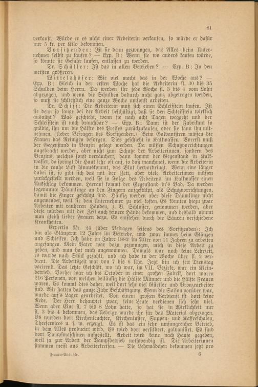 Dr. Schiff: Die Arbeiterin muß sich einen Schleifstein kaufen. Ist sie denn so lange bei der Arbeit beschäftigt, daß sie den Schleifstein wirklich ausnützt? Was geschieht, wenn sie nach acht Tagen weggeht und der Schleifstein ist noch brauchbar? Exp. L: Dann ist der Fabrikant so gnädig, ihn um die Hälfte des Preises zurückzukaufen, oder sie kann ihn mit­nehmen. (Ueber Befragen des Vorsitzenden.) Beim Galvanisiren müssen die Frauen das Reinigen besorgen. Dies geschieht in Kalkwasser. Vorerst muß der Gegenstand in Benzin gelegt werden. Da müssen Schutzvorrichtungen angebracht werden, aber nicht zum Schutze der Arbeiterinnen, sondern des Benzins, welches sonst verräuchert, dann kommt der Gegenstand in Kalk­wasser, da springt die Haut sehr oft auf, so daß manchmal, wenn die Arbeiterin in die rauhe Lust hinauskommt, das Blut hervordringt. Wenn eine länger dabei ist, so gibt sich das mit der Zeit, aber viele Arbeiterinnen müssen zurückgestellt werden, weil sie in Folge des Arbeitens im Kalkwasser einen Ausschlag bekommen. Hierauf kommt der Gegenstand in's Bad. Da werden sogenannte Däumlinge an den Fingern aufgestülpt, als Schutzvorrichtungen, damit die Finger geschützt sind. Häufig werden aber diese Däumlinge nicht angewendet, weil sie dem Unternehmer zu viel kosten. Es könnten hiezu zwar Arbeiter mit rauheren Händen, z. V. Schlosser, genommen werden, aber diese würden mit der Zeit auch feinere Hände bekommen, und deshalb nimmt man gleich lieber Frauen dazu. Es entstehen durch die Säuren verschiedene Krankheiten.