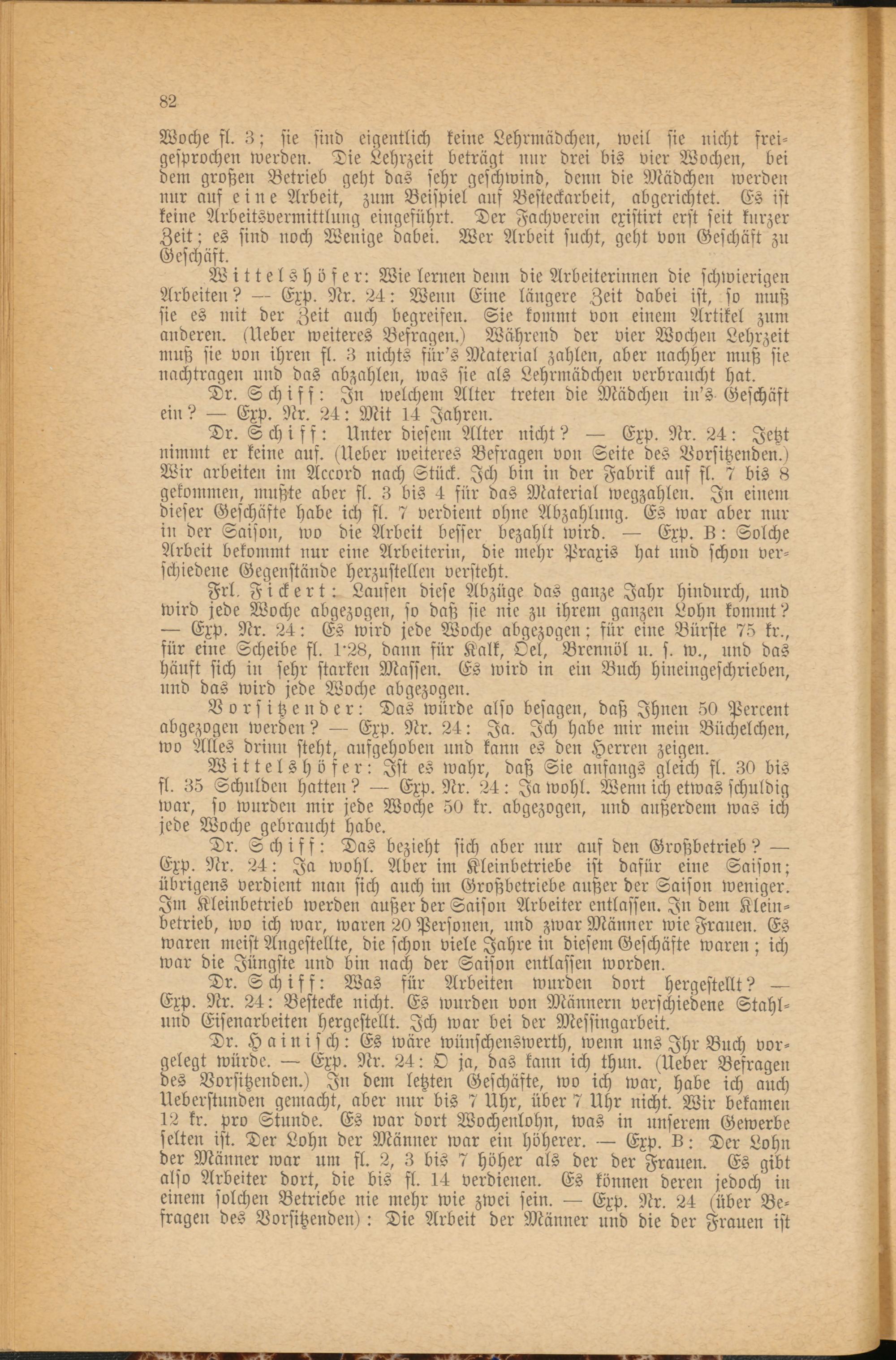 Dr. Schiff: Unter diesem Alter nicht? Exp. Nr. 24: Jetzt nimmt er keine auf. (Ueber weiteres Befragen von Seite des Vorsitzenden.) Wir arbeiten im Accord nach Stück. Ich bin in der Fabrik auf fl. 7 bis 8 gekommen, mußte aber fl. 3 bis 4 für das Material Wegzahlen. In einen: dieser Geschäfte habe ich fl. 7 verdient ohne Abzahlung. Es war aber nur in der Saison, wo die Arbeit besser bezahlt wird. Exp. L: Solche Arbeit bekommt nur eine Arbeiterin, die mehr Praxis hat und schon ver­schiedene Gegenstände herzustellen versteht.