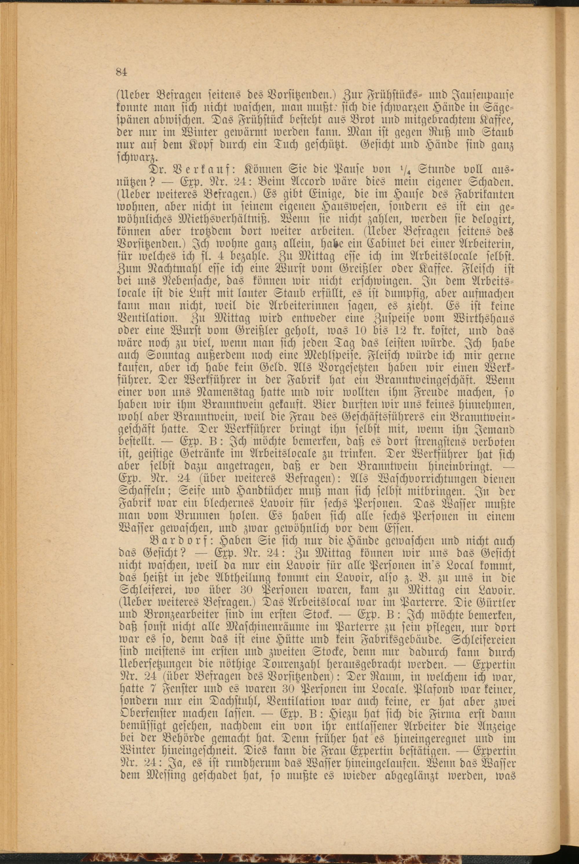 Dr. Verkauf: Können Sie die Pause bon Stunde voll ausnützen? — Exp. Nr. 24: Beim Accord wäre dies mein eigener Schaden. (Ueber weiteres Befragen.) Es gibt Einige, die im Hause des Fabrikanten wohnen, aber nicht in seinem eigenen Hauswesen, sondern es ist ein gewöhnliches Miethsverhältniß. Wenn sie nicht zahlen, werden sie delogirt, können aber trotzdem dort weiter arbeiten. (Ueber Befragen seitens des Vorsitzenden.) Ich wohne ganz allein, hahe ein Cabinet bei einer Arbeiterin, für welches ich sl. 4 bezahle. Zu Mittag esse ich im Arbeitslocale selbst. Zum Nachtmahl esse ich eine Wurst vom Greißler oder Kaffee. Fleisch ist bei uns Nebensache, das können wir nicht erschwingen. In dem Arbeitslocale ist die Luft mit lauter Staub erfüllt, es ist dumpfig, aber ausmachen kann man nicht, weil die Arbeiterinnen sagen, es zieht. Es ist keine Ventilation. Zu Mittag wird entweder eine Zuspeise vom Wirthshaus oder eine Wurst vom Greißler geholt, was 10 bis 12 kr. kostet, und das wäre noch zu viel, wenn man sich jeden Tag das leisten würde. Ich habe auch Sonntag außerdem noch eine Mehlspeise. Fleisch würde ich mir gerne kaufen, aber ich habe kein Geld. Als Vorgesetzten haben wir einen Werkführer. Der Werkführer in der Fabrik hat ein Branntweingeschäft. Wenn einer von uns Namenstag hatte und wir wollten ihm Freude machen, so haben wir ihm Branntwein gekauft. Bier dursten wir uns keines hinnehmen, wohl aber Branntwein, weil die Frau des Geschäftsführers ein Branntweingeschäft hatte. Der Werkführer bringt ihn selbst mit, wenn ihn Jemand bestellt. — Exp. 8: Ich möchte bemerken, daß es dort strengstens verboten ist, geistige Getränke im Arbeitslocale zu trinken. Der Werkführer hat sich aber selbst dazu angetragen, daß er den Branntwein hineinbringt. — Exp. Nr. 24 (über weiteres Befragen): Als Waschvorrichtungen dienen Schaffeln; Seife und Handtücher muß man sich selbst mitbringen. In der Fabrik war ein blechernes Lavoir für sechs Personen. Das Wasser mußte man vom Brunnen holen. Es haben sich alle sechs Personen in einem Wasser gewaschen, und zwar gewöhnlich vor dem Essen.