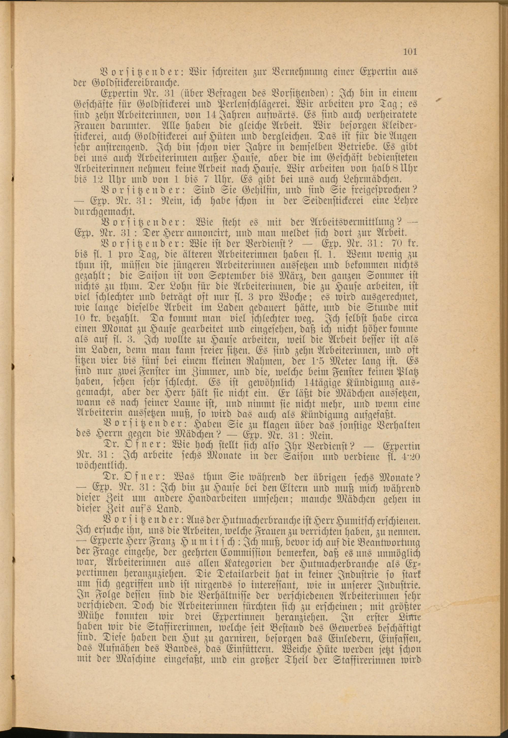 Vorsitzender: Wie ist der Verdienst? — Exp. Nr. 31: 70 kr. bis st. 1 pro Tag, die älteren Arbeiterinnen haben st. 1. Wenn wenig zu thun ist, müssen die jüngeren Arbeiterinnen aussetzen und bekommen nichts gezahlt; die Saison ist von September bis März, den ganzen Sommer ist nichts zu thun. Der Lohn für die Arbeiterinnen, die zu Hause arbeiten, ist viel schlechter und beträgt oft nur st. 3 pro Woche; es wird ausgerechnet, wie lange dieselbe Arbeit im Laden gedauert hätte, und die Stunde mit 10 kr. bezahlt. Da kommt man viel schlechter weg. Ich selbst habe circa einen Monat zu Hause gearbeitet und eingesehen, daß ich nicht höher komme als auf fl. 3. Ich wollte zu Hause arbeiten, weil die Arbeit besser ist als im Laden, denn man kann freier sitzen. Es sind zehn Arbeiterinnen, und oft sitzen vier bis fünf bei einen: kleinen Rahmen, der 15 Meter lang ist. Es sind nur zwei Fenster im Zimmer, und die, welche beim Fenster keinen Platz haben, sehen sehr schlecht. Es ist gewöhnlich 14tägige Kündigung ausgemacht, aber der Herr hält sie nicht ein. Er läßt die Mädchen aussetzen, wann es nach seiner Laune ist, und nimmt sie nicht mehr, und wenn eine Arbeiterin aussetzen muß, so wird das auch als Kündigung aufgefaßt.