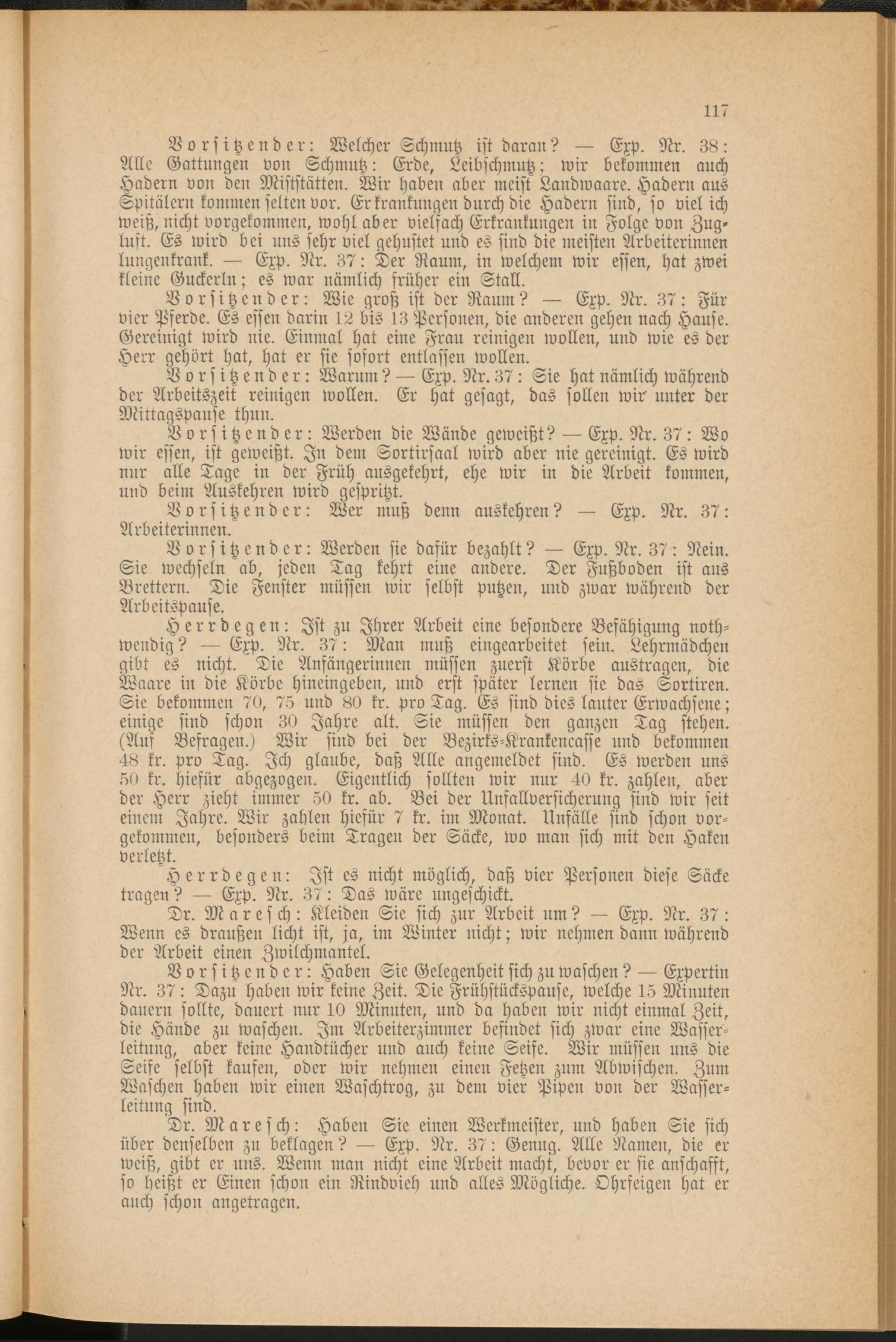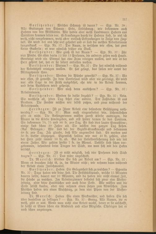 Vorsitzender: Werden die Wände geweißt? Exp. Nr. 37 : Wo wir essen, ist geweißt. In dem Sortirsaal wird aber nie gereinigt. Es wird nur alle Tage in der Früh ausgekehrt, ehe wir in die Arbeit kommen, und beim Auskehren wird gespritzt.