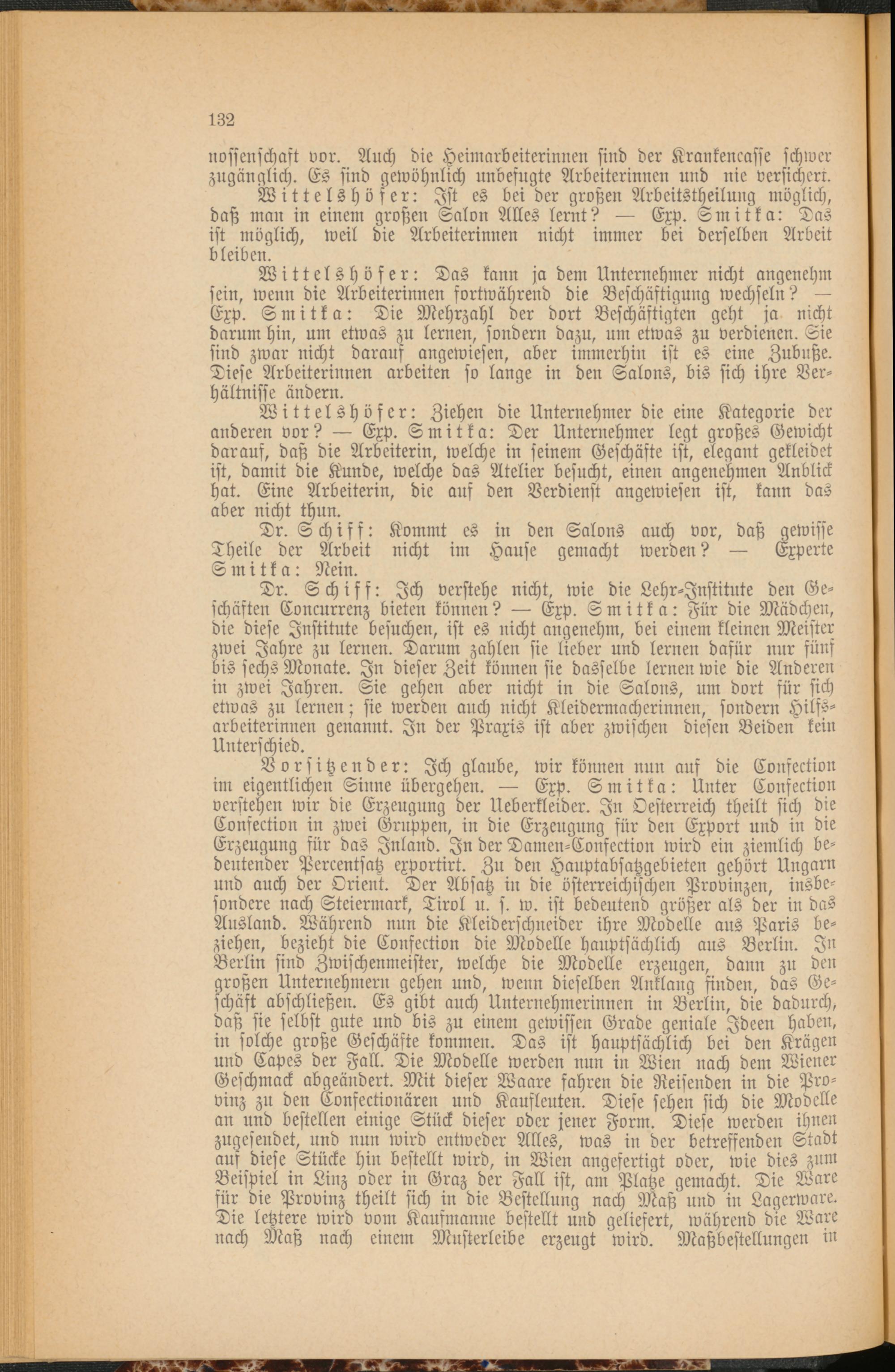 Dr. Schiff: Ich verstehe nicht, wie die Lehr-Jnstitute den Geschäften Concurrenz bieten können? — Exp. Smitka: Für die Mädchen, die diese Institute besuchen, ist es nicht angenehm, bei einem kleinen Meister zwei Jahre zu lernen. Darum zahlen sie lieber und lernen dafür nur fünf bis sechs Monate. In dieser Zeit können sie dasselbe lernen wie die Anderen in zwei Jahren. Sie gehen aber nicht in die Salons, um dort für sich etwas zu lernen; sie werden auch nicht Kleidermacherinnen, sondern Hilfs- arbeiterinnen genannt. In der Praxis ist aber zwischen diesen Beiden kein Unterschied.