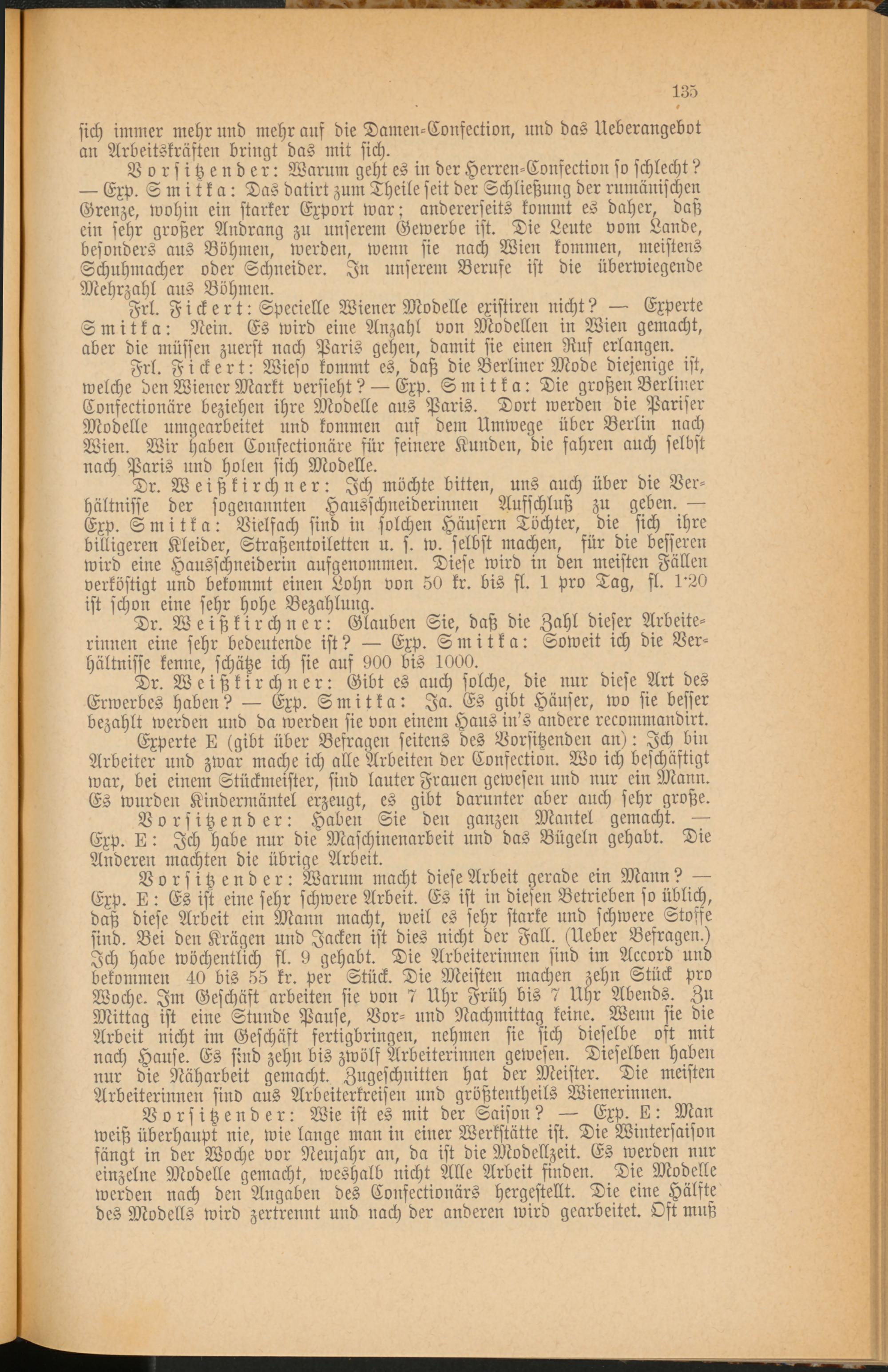 Frl. Fickert: Wieso kommt es, daß die Berliner Mode diejenige ist, welche den Wiener Markt versieht? — Exp. Smitka: Die großen Berliner Confectionäre beziehen ihre Modelle aus Paris. Dort werden die Pariser- Modelle umgearbeitet und kommen auf dem Umwege über Berlin nach Wien. Wir haben Confectionäre für feinere Kunden, die fahren auch selbst nach Paris und holen sich Modelle.