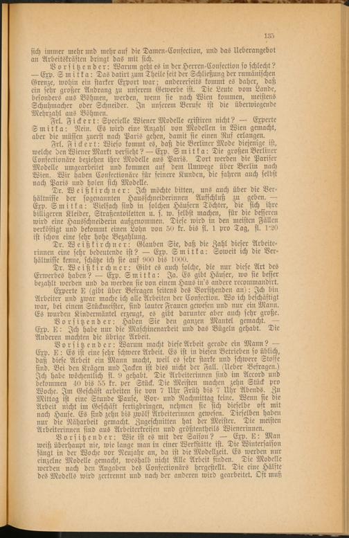 Dr. Weißkirchner: Ich möchte bitten, uns auch über die Verhältnisse der sogenannten Hausschneiderinnen Aufschluß zu geben. — Exp. Smitka: Vielfach sind in solchen Häusern Töchter, die sich ihre billigeren Kleider, Straßentoiletten u. s. w. selbst machen, für die besseren wird eine Hausschneiderin aufgenommen. Diese wird in den meisten Fällen verköstigt und bekommt einen Lohn von 50 kr. bis fl. 1 pro Tag, fl. U20 ist schon eine sehr hohe Bezahlung.