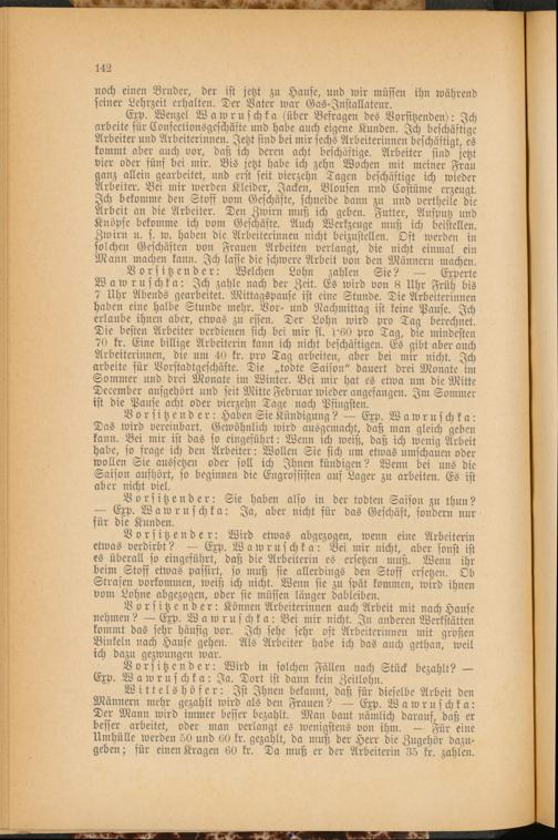 Exp. Wenzel Wawruschka (über Befragen des Vorsitzenden): Ich arbeite für Confectionsgeschäste und habe auch eigene Kunden. Ich beschäftige Arbeiter und Arbeiterinnen. Jetzt sind bei mir sechs Arbeiterinnen beschäftigt, es kommt aber auch vor, daß ich deren acht beschäftige. Arbeiter sind jetzt vier oder fünf bei mir. Bis jetzt habe ich zehn Wochen mit meiner Frau ganz allein gearbeitet, und erst seit vierzehn Tagen beschäftige ich wieder Arbeiter. Bei mir werden Kleider, Jacken, Blousen und Costüme erzeugt. Ich bekomme den Stoff vom Geschäfte, schneide dann zn und vertheile die Arbeit an die Arbeiter. Den Zwirn muß ich geben. Futter, Aufputz und Knöpfe bekomme ich vom Geschäfte. Auch Werkzeuge muß ich beistellen. Zwirn n. s. w. haben die Arbeiterinnen nicht beizustellen. Oft werden in solchen Geschäften von Frauen Arbeiten verlangt, die nicht einmal ein Mann machen kann. Ich lasse die schwere Arbeit von den Männern machen.