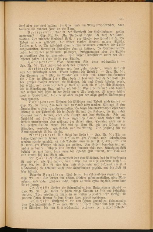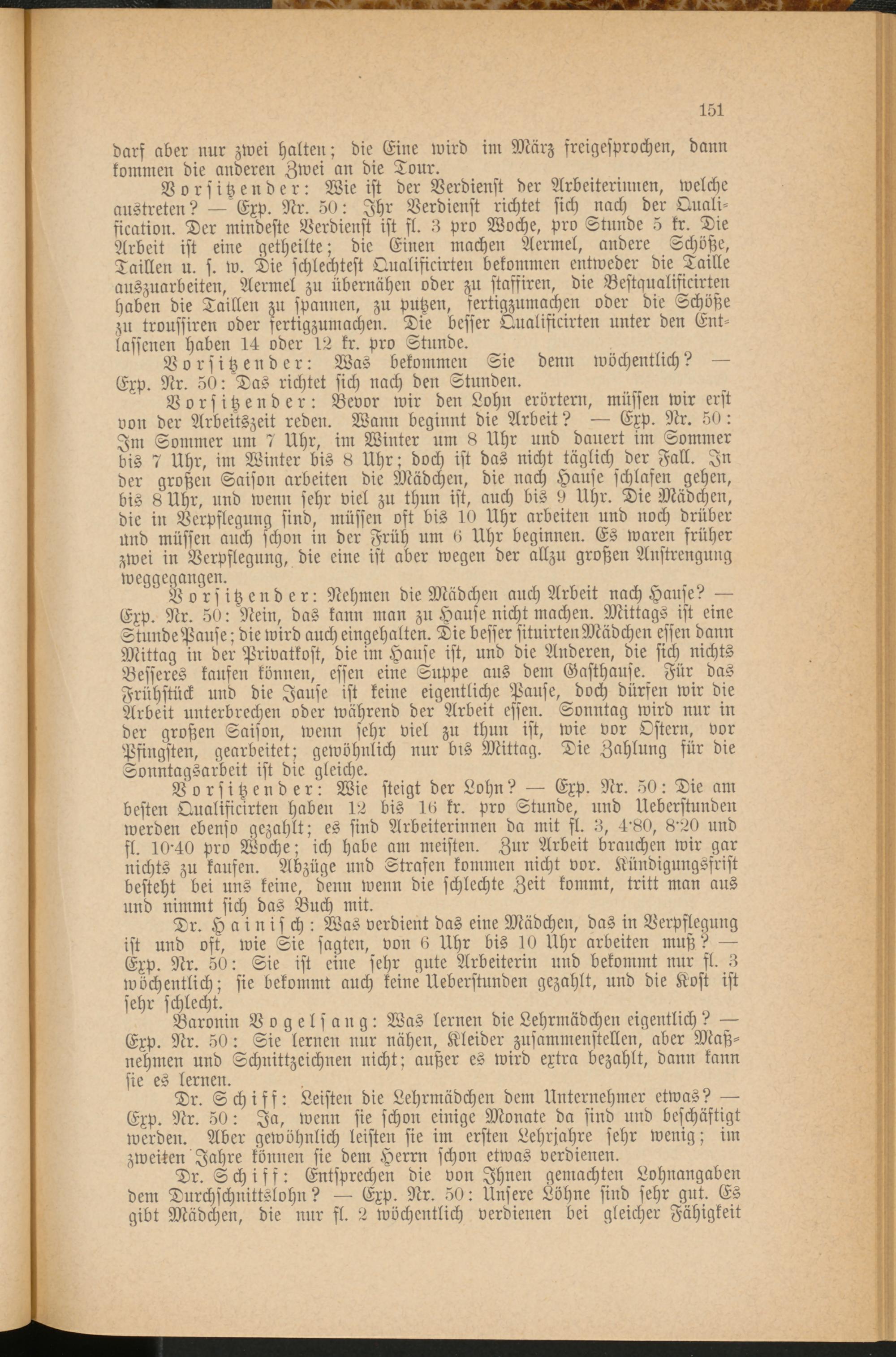 Dr. Schiff: Entsprechen die von Ihnen gemachten Lohnangaben dem Durchschnittslohn? Exp. Nr. 50: Unsere Löhne sind sehr gut. Es gibt Mädchen, die mir fl. 2 wöchentlich verdienen bei gleicher Fähigkeit