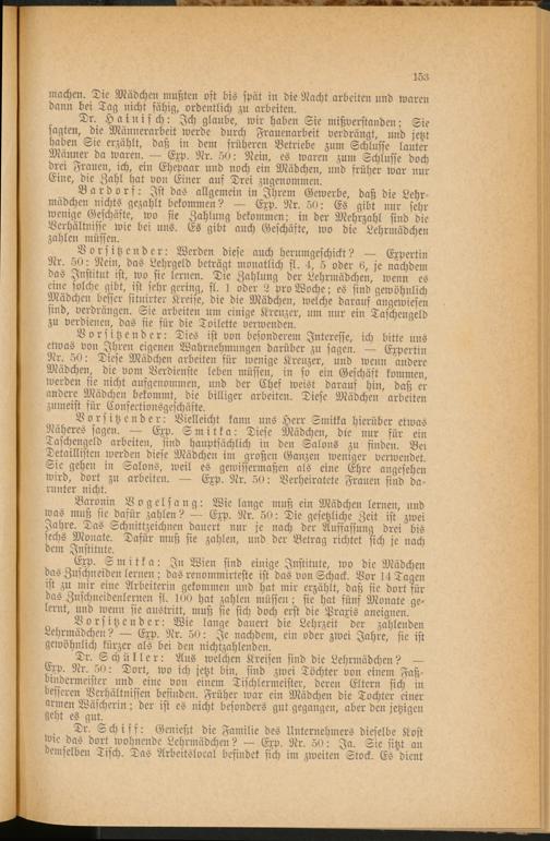 Vorsitzender: Werden diese auch herumgeschickt? — Expertin Nr. 50: Nein, das Lehrgeld beträgt monatlich sl. 4, 5 oder 6, je nachdem das Institut ist, wo sie lernen. Die Zahlung der Lehrmädchen, wenn es eine solche gibt, ist sehr gering, fl. 1 oder 2 pro Woche; es sind gewöhnlich Mädchen besser situirter Kreise, die die Mädchen, welche darauf angewiesen sind, verdrängen. Sie arbeiten um einige Kreuzer, um nur ein Taschengeld zu verdienen, das sie für die Toilette verwenden.