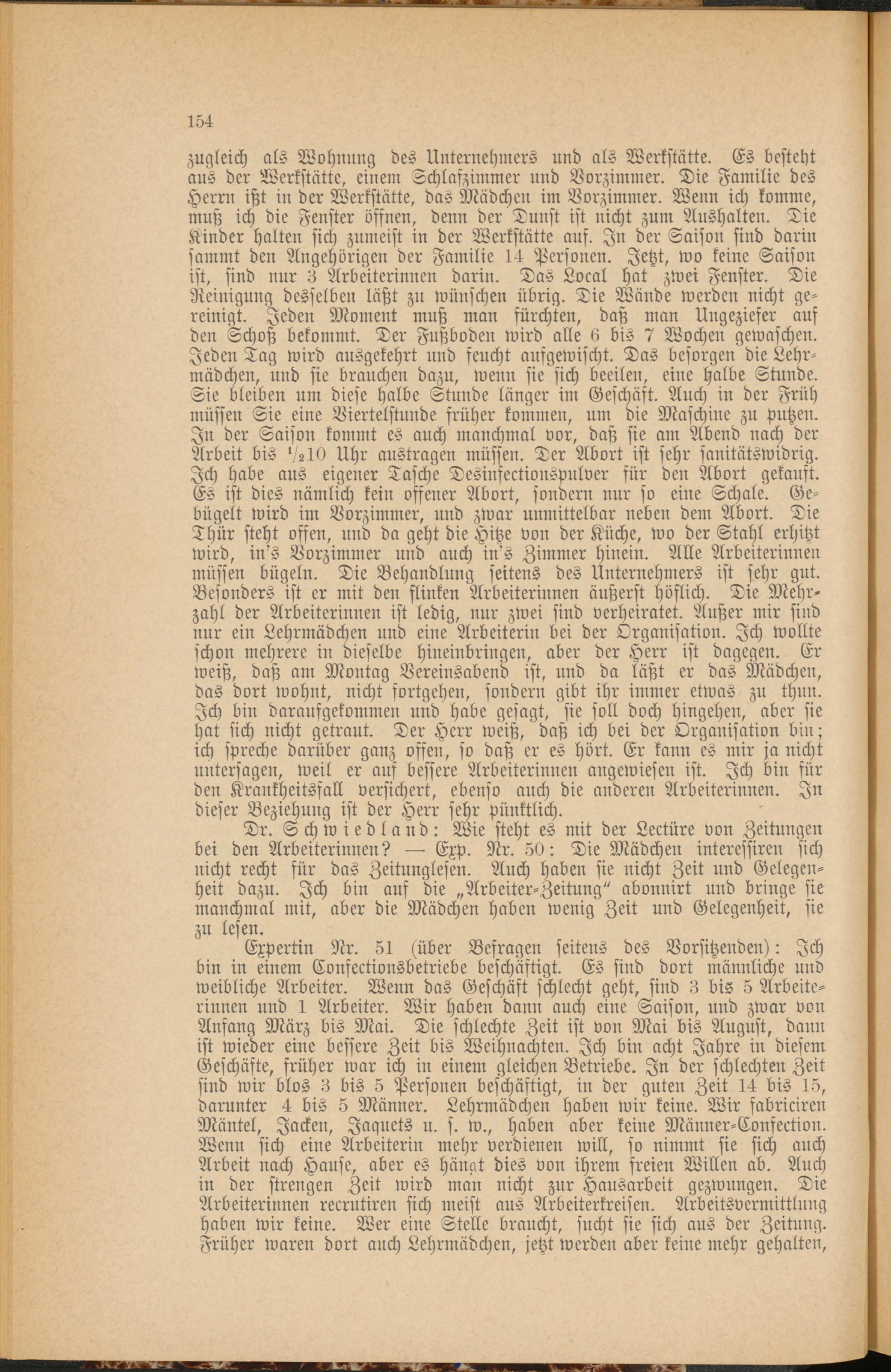 zugleich als Wohnung des Unternehmers und als Werkstätte. Es besteht aus der Werkstätte, einem Schlafzimmer und Vorzimmer. Die Familie des Herrn ißt in der Werkstätte, das Mädchen im Vorzimmer. Wenn ich komme, muß ich die Fenster öffnen, denn der Dunst ist nicht zum Aushalten. Die Kinder halten sich zumeist in der Werkstätte auf. In der Saison sind darin sammt den Angehörigen der Familie 14 Personen. Jetzt, wo keine Saison ist, sind nur 3 Arbeiterinnen darin. Das Local hat zwei Fenster. Die Reinigung desselben läßt zu wünschen übrig. Die Wände werden nicht gereinigt. Jeden Moment muß man fürchten, daß man Ungeziefer auf den Schoß bekommt. Der Fußboden wird alle 6 bis 7 Wochen gewaschen. Jeden Tag wird ausgekehrt und feucht aufgewischt. Das besorgen die Lehrmädchen, und sie brauchen dazu, wenn sie sich beeilen, eine halbe Stunde. Sie bleiben um diese halbe Stunde länger im Geschäft. Auch in der Früh müssen Sie eine Viertelstunde früher kommen, um die Maschine zu putzen. In der Saison kommt es auch manchmal vor, daß sie am Abend nach der Arbeit bis ',210 Uhr austragen müssen. Der Abort ist sehr sanitätswidrig. Ich habe aus eigener Tasche Desinsectionspulver für den Abort gekauft. Es ist dies nämlich kein offener Abort, sondern nur so eine Schale. Gebügelt wird im Vorzimmer, und zwar unmittelbar neben dem Abort. Die Thür steht offen, und da geht die Hitze von der Küche, wo der Stahl erhitzt wird, in's Vorzimmer und auch in's Zimmer hinein. Alle Arbeiterinnen müssen bügeln. Die Behandlung seitens des Unternehmers ist sehr gut. Besonders ist er mit den flinken Arbeiterinnen äußerst höflich. Die Mehrzahl der Arbeiterinnen ist ledig, nur zwei sind verheiratet. Außer mir sind nur ein Lehrmädchen und eine Arbeiterin bei der Organisation. Ich wollte schon mehrere in dieselbe hineinbringen, aber der Herr ist dagegen. Er weiß, daß am Montag Vereinsabend ist, und da läßt er das Mädchen, das dort wohnt, nicht fortgehen, sondern gibt ihr immer etwas zu thun. Ich bin daraufgekommen und habe gesagt, sie soll doch hingehen, aber sie hat sich nicht getraut. Der Herr weiß, daß ich bei der Organisation bin; ich spreche darüber ganz offen, so daß er es hört. Er kann es mir ja nicht untersagen, weil er aus bessere Arbeiterinnen angewiesen ist. Ich bin für den Krankheitsfall versichert, ebenso auch die anderen Arbeiterinnen. In dieser Beziehung ist der Herr sehr pünktlich.