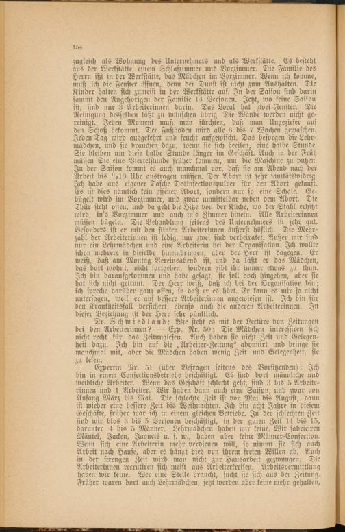 Expertin Nr. 51 (über Befragen seitens des Vorsitzenden): Ich bin in einem Confectionsbetriebe beschäftigt. Es sind dort männliche und weibliche Arbeiter. Wenn das Geschäft schlecht geht, sind 3 bis 5 Arbeiterinnen und 1 Arbeiter. Wir haben dann auch eine Saison, und zwar von Anfang März bis Mai. Die schlechte Zeit ist von Mai bis August, dann ist wieder eine bessere Zeit bis Weihnachten. Ich bin acht Jahre in diesem Geschäfte, früher war ich in einem gleichen Betriebe. In der schlechten Zeit sind wir blos 3 bis 5 Personen beschäftigt, in der guten Zeit 14 bis 15, darunter 4 bis 5 Männer. Lehrmädchen haben wir keine. Wir fabriciren Mäntel, Jacken, Jaquets u. s. w., haben aber keine Männer-Confection. Wenn sich eine Arbeiterin mehr verdienen will, so nimmt sie sich anch Arbeit nach Hause, aber es hängt dies von ihrem freien Willen ab. Auch in der strengen Zeit wird man nicht zur Hausarbeit gezwungen. Die Arbeiterinnen recrutiren sich meist aus Arbeiterkreisen. Arbeitsvermittlung haben wir keine. Wer eine Stelle braucht, sucht sie sich aus der Zeitung. Früher waren dort auch Lehrmädchen, jetzt werden aber keine mehr gehalten,