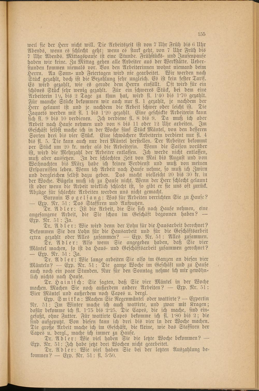 weil sie der Herr nicht will. Die Arbeitszeit ist von 7 Uhr Früh bis 6 Uhr Abends, wenn es schlecht geht: wenn es stark geht, von 7 Uhr Früh bis 7 Uhr Abends. Mittagspause ist eine Stunde. Frühstücks- und Jausenpause haben wir keine. Zu Mittag gehen alle Arbeiter aus der Werkstätte. Über­stunden kommen niemals vor. Von den Arbeiterinnen wohnt niemand beim Herrn. An Sonn- und Feiertagen wird nie gearbeitet. Wir werden nach Stück gezahlt, doch ist die Bezahlung sehr ungleich. Es ist kein fester Tarif. Es wird gezahlt, wie es gerade dem Herrn einfällt. Oft wird für ein schönes Stück sehr wenig gezahlt. Für ein schweres Stück, bei dem eine Arbeiterin 1'/^ bis 2 Tage zu thun hat, wird fl. 1'40 bis 1'70 gezahlt. Für manche Stücke bekommen wir auch nur fl. 1 gezahlt, je nachdem der Herr gelaunt ist und je nachdem die Arbeit schwer oder leicht ist. Die Jaquets werden mit fl. 1 bis 1'20 gezahlt. Eine geschickte Arbeiterin kann sich fl. 9 bis 10 verdienen. Ich verdiene fl. 8 bis 9. Da muß ich aber Arbeit nach Hause nehmen und von 8 bis 11 oder 12 Uhr arbeiten. Im Geschäft selbst mache ich in der Woche fünf Stück Mäntel, von den besseren Sorten drei bis vier Stück. Eine schwächere Arbeiterin verdient nur fl. 4 bis fl. 5. Die kann auch nur drei Mäntel herstellen. Der Arbeiter bekommt per Stück um 20 kr. mehr als die Arbeiterin. Wenn die Saison vorüber ist, wird die Mehrzahl der Arbeiter entlassen. Ich werde nicht entlassen, muß aber aussetzen. In der schlechten Zeit von Mai bis August und von Weihnachten bis März habe ich keinen Verdienst und muß von meinen Ersparnissen leben. Wenn ich Arbeit nach Hause nehme, so muß ich Zwirn und dergleichen selbst dazu geben. Das macht vielleicht 20 bis 30 kr. in der Woche. Bügeln muß ich zu Hause nicht. Wenn der Herr schlecht gelaunt ist oder wenn die Arbeit wirklich schlecht ist, so gibt er sie uns oft zurück. Abzüge für schlechte Arbeiten werden uns nicht gemacht.