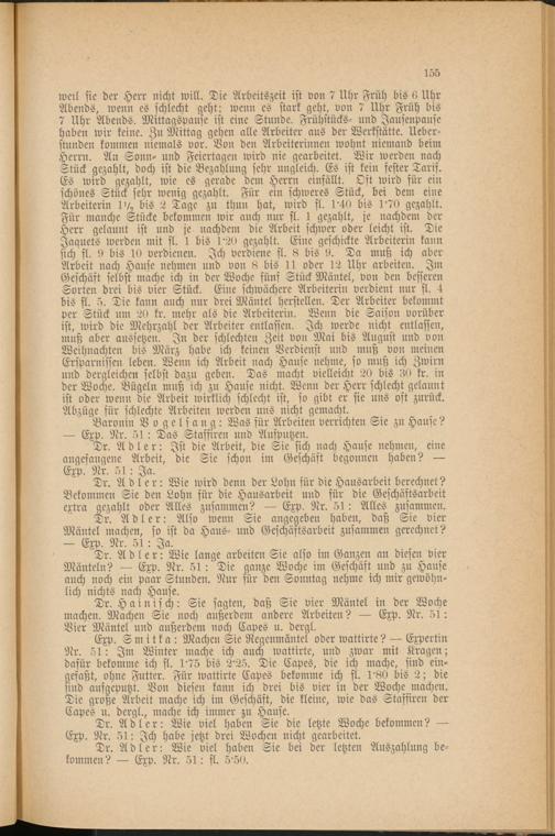 Dr. Adler: Wie lange arbeiten Sie also im Ganzen an diesen vier Mänteln? Exp. Nr. 51: Die ganze Woche im Geschäft und zu Hause auch noch ein paar Stunden. Nur für den Sonntag nehme ich mir gewöhn­lich nichts nach Hause.